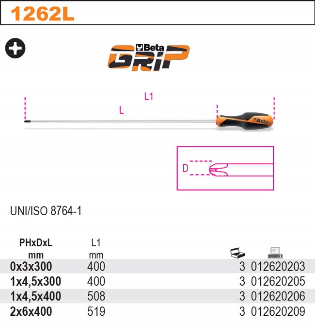 Профиль длиной поперечной отвертки Phillips, Betagrip, модель 1262LPH/ 1, 4,5x400 мм h1> модель 1262L/ 1x400 h2>