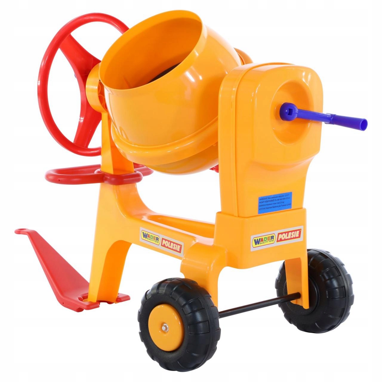 от ПОЛЕСЬЕОна большая (высота 67 см). , имеет большой барабан и позволяет смешивать различные ингредиенты в больших количествах. Вращение рукоятки заставляет барабан вращаться, а вместе с ним и все, что находится внутри. Благодаря специальной ручке барабан бетоносмесителя можно наклонять, что позволяет легко его опорожнить. Игрушка имеет два широких колеса. Это позволяет эффективно транспортировать его.