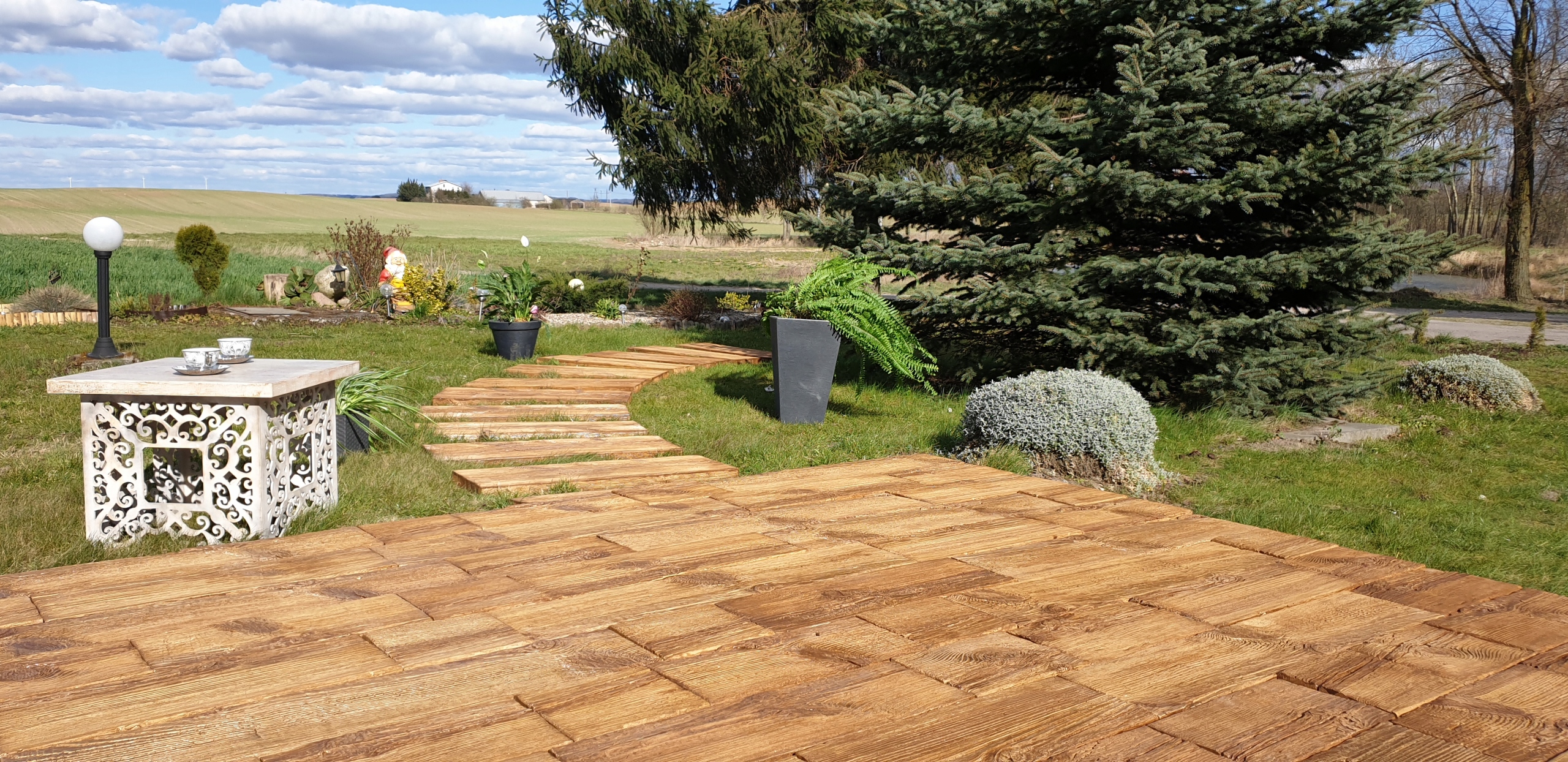 Соответствующая подготовка основания. Древесину нельзя укладывать непосредственно на траву или влажные места. Перед началом монтажных работ снимите верхний слой земли, а затем подготовьте фундамент, используя гравий или заполнители. Основание следует уплотнить с помощью виброплиты или другого приспособления, используемого для этой цели. В зависимости от типа почвы несущая способность должна составлять не менее 10 см – 30 см. На следующем этапе его засыпают песчано-цементной смесью, толщина которой должна быть не менее 3 см. На подготовленную площадку укладываем бетонные плиты. Расстояния между отдельными досками заделываем песком.