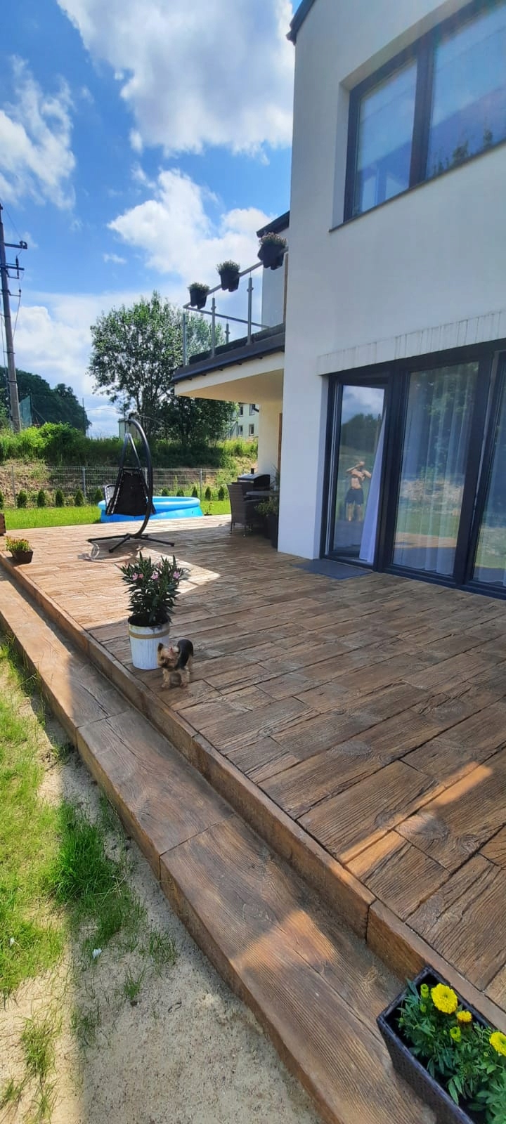 Правильно подготовленная поверхность. Перед началом работ землю необходимо выровнять. Приклеиваем бетонную древесину к поверхности с помощью высокоэластичного полимерного клея (имеется в нашем предложении). Его следует распределить равномерно по всей поверхности. На подготовленную площадку укладываем бетонные плиты. Расстояния между отдельными досками заделываем песком.