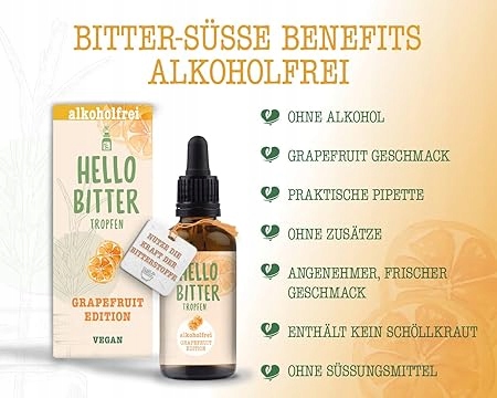 Откройте для себя уникальную силу горьких капель из Серия Hello Bitter, в издании со вкусом грейпфрута! Hello Bitter Tropfen – это натуральная пищевая добавка, предлагающая альтернативу повседневным перекусам и стимуляторам. Созданный в Германии, полностью веганский продукт является ответом на потребности тех, кто ищет здоровое и осознанное питание.