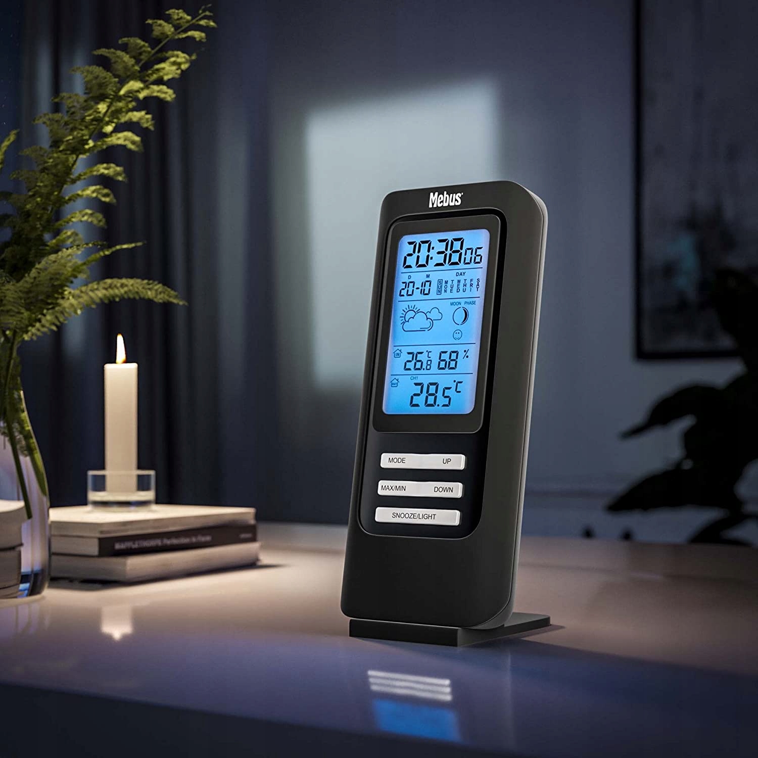 - Цифровой термометр и гигрометр для внутреннего и наружного применения: просто посмотрите текущую температуру внутри и снаружи в °C или °F и влажность в помещении в %.