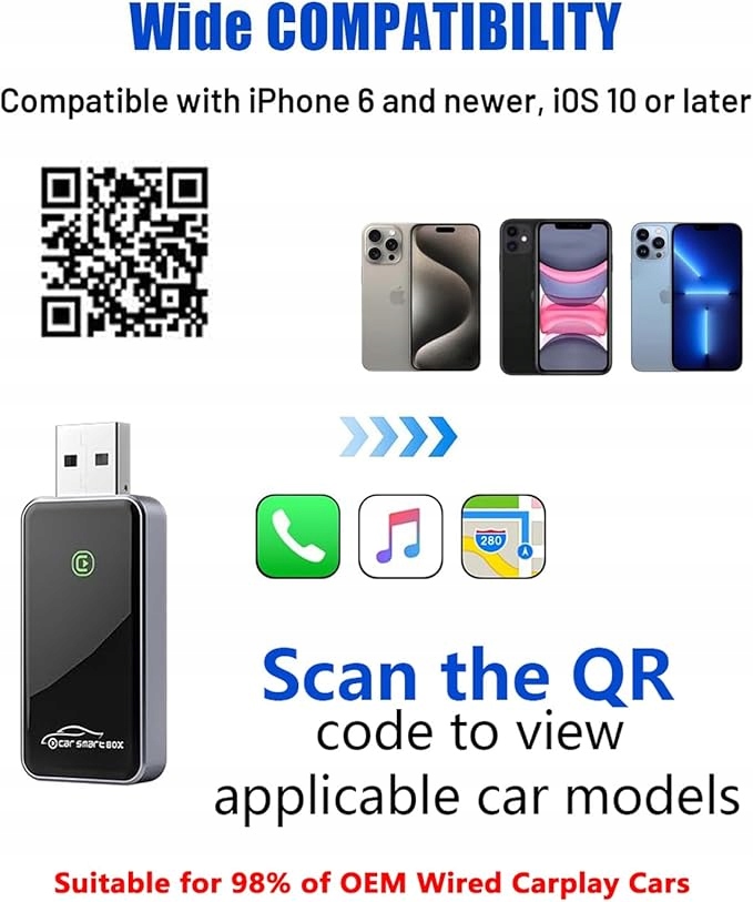 Широкая совместимость со многими автомобильными брендами, этот продукт совместим со всеми брендами и моделями транспортных средств, которые поддерживают функцию проводной работы CarPlay. Пока ваша автомобильная система имеет функцию проводной работы CarPlay, этот адаптер может легко преобразовать его в беспроводной режим, так что вы можете пользоваться преимуществами беспроводной технологии.