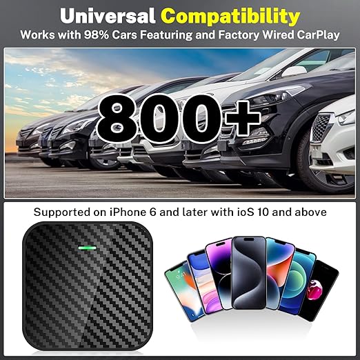 Универсальная совместимость Этот беспроводной ключ Carplay совместим с 98% автомобилей, представленных на рынке, а также с iPhone 7 или новее. Если вы не уверены, совместим ли наш беспроводной адаптер Carplay с вашим автомобилем, отправьте нам электронное письмо. Оснащен адаптером USB-USB-C, обеспечивающим доступ к автомобильным портам USB и USB-C.
