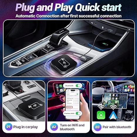 Автоматическое быстрое подключение: подключи и работай; После первого успешного подключения этот адаптер CarPlay автоматически и быстро подключится к вашему телефону, когда вы сядете в машину; для подключения телефона к автомобилю не требуется использовать USB-кабель; избегайте путаницы проводов и следите за чистотой и порядком в салоне; просто наслаждайтесь путешествием.