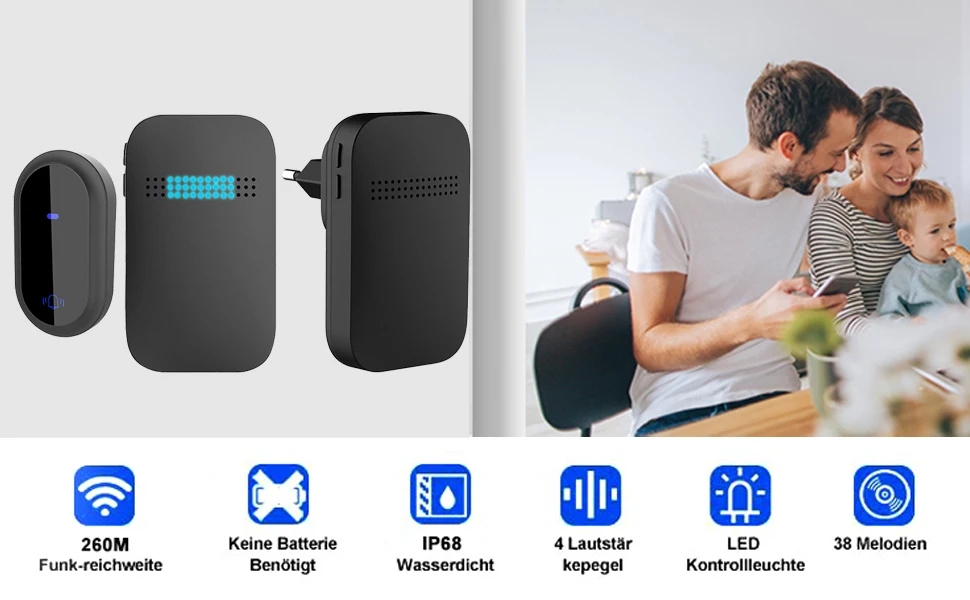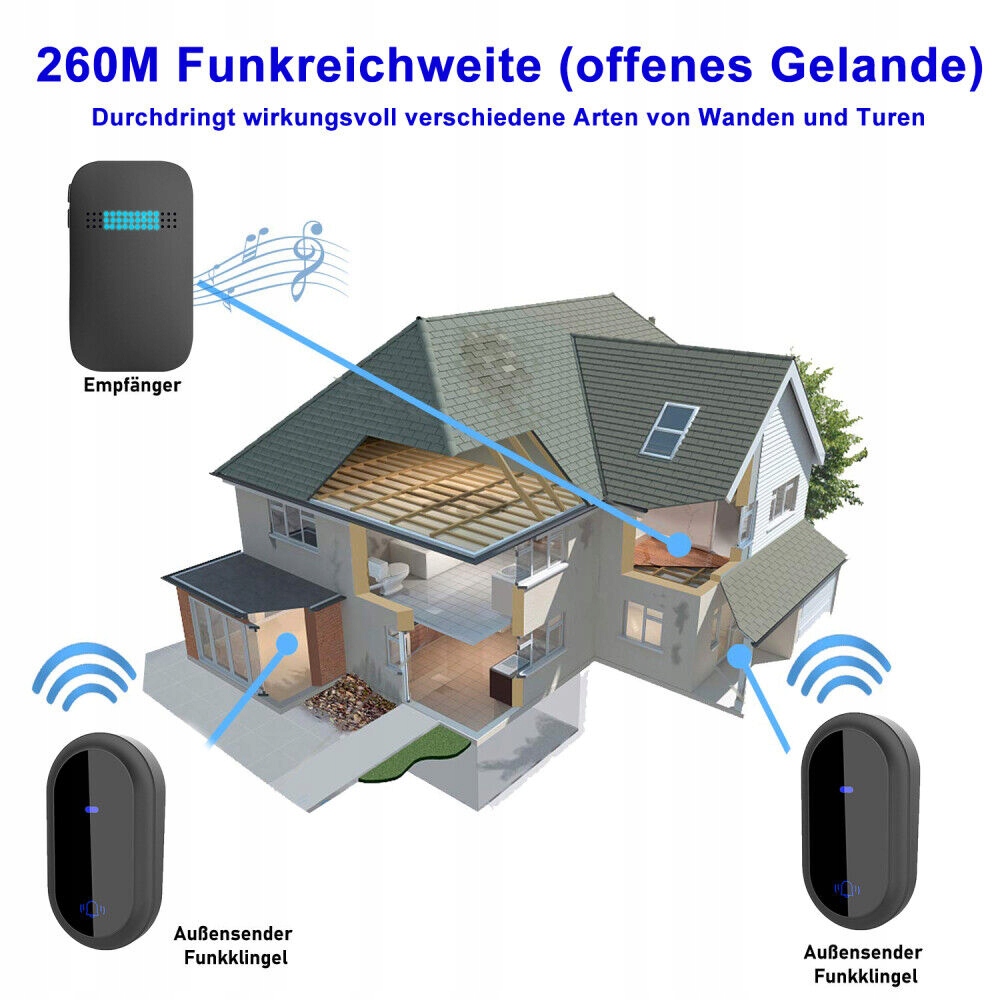 【Легкая установка】 Просто подключите мини -приемник к электрическому розетке и прикрепите передатчик к стене, используя доступные аксессуары, включая кусок самооклонной ленты. Наш дверной звонок подходит для дома, квартиры, школы, дома в сельской местности, офиса и многое другое. Этот беспроводной дверной колокол без батареи - хороший рождественский, день рождения или юбилейный подарок для каждого дома или владельца компании.
