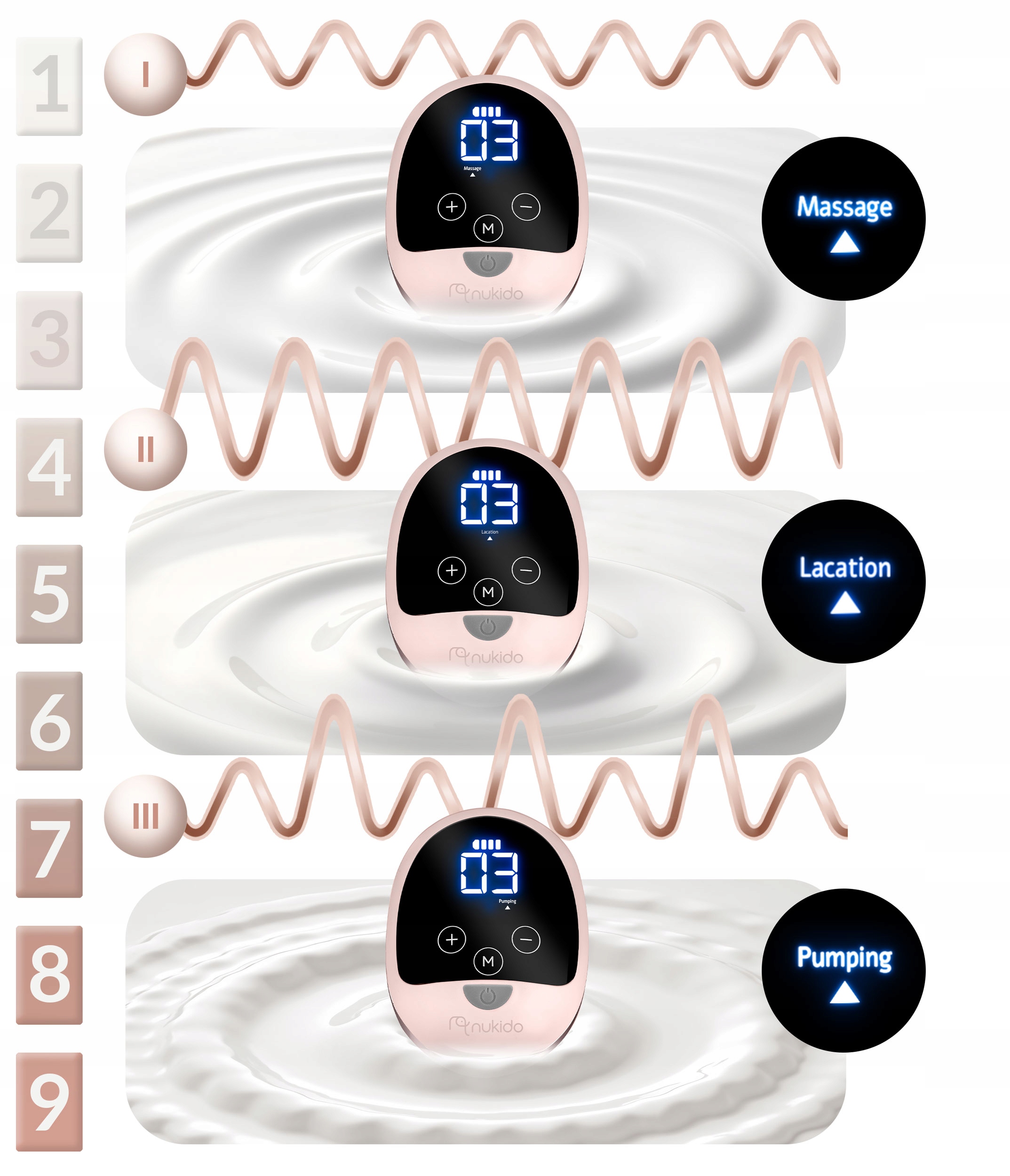 Технология, используемая в поле для груди, верно отражает естественный ритм сосания ребенка и создает эффективный, естественный метод тяги молока. Электрический насос для молочной железы Nukido позволяет выбирать правую фазу стимуляции лактации: