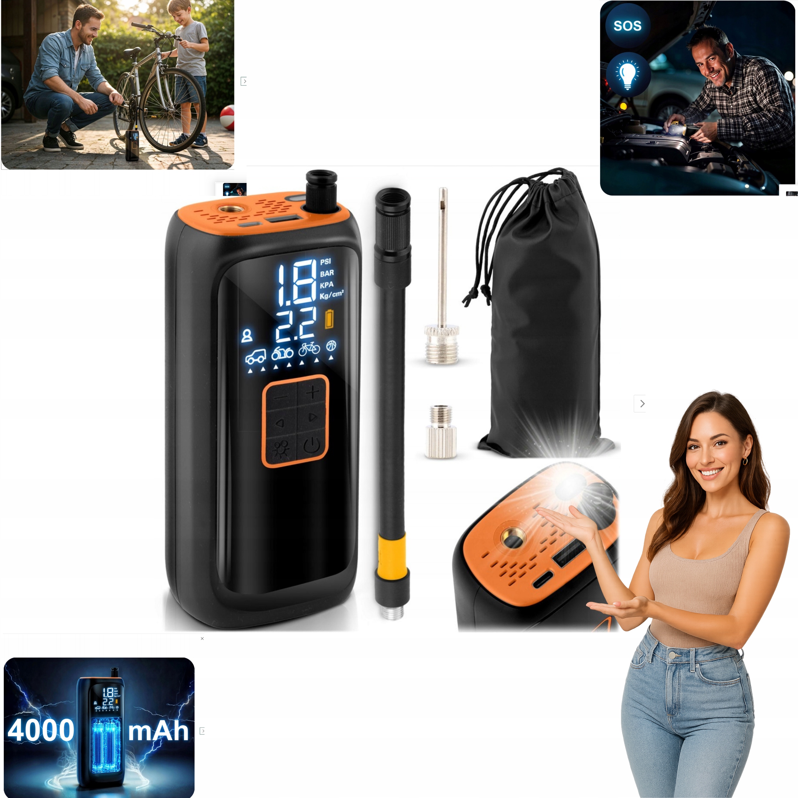 БЕСПРОВОДНОЙ КОМПРЕССОРНЫЙ НАСОС 4000МАЧ 22 Л/МИН 10,3 БАР USB-C ФОНАРИК SOS