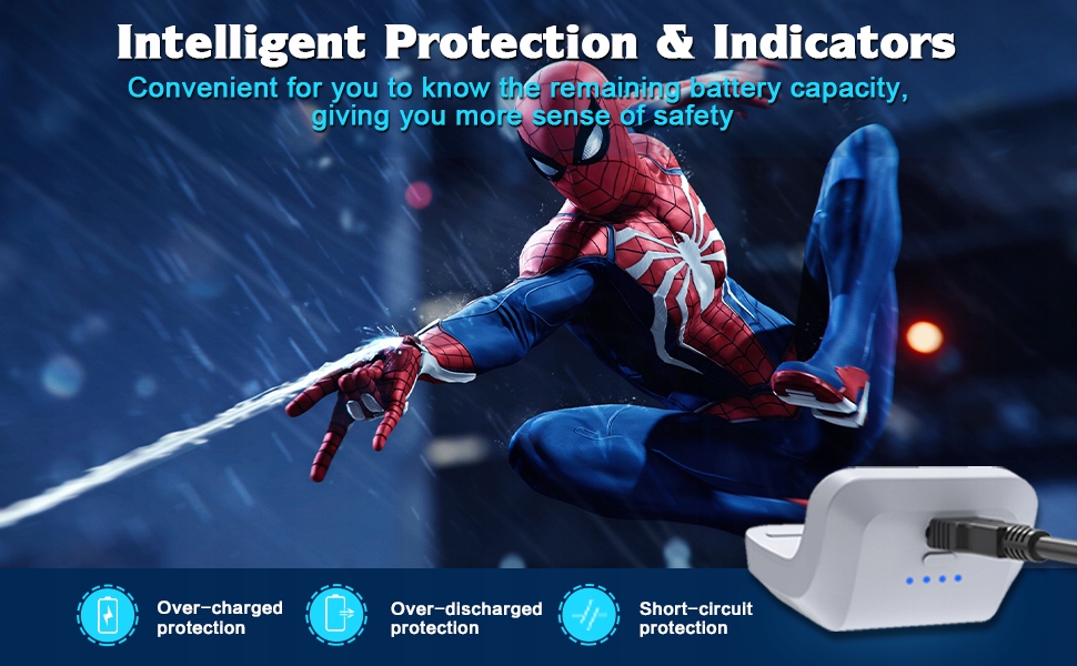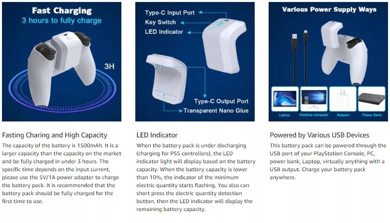 【Высокая емкость и более высокая зарядка】】 емкость батареи составляет 1500 мАч, а зарядный ток составляет 560 мА. Полная зарядка аккумулятора занимает всего 3 часа. Свет и компактный дизайн облегчает перенос и зарядку контроллера PS5 в любое время.