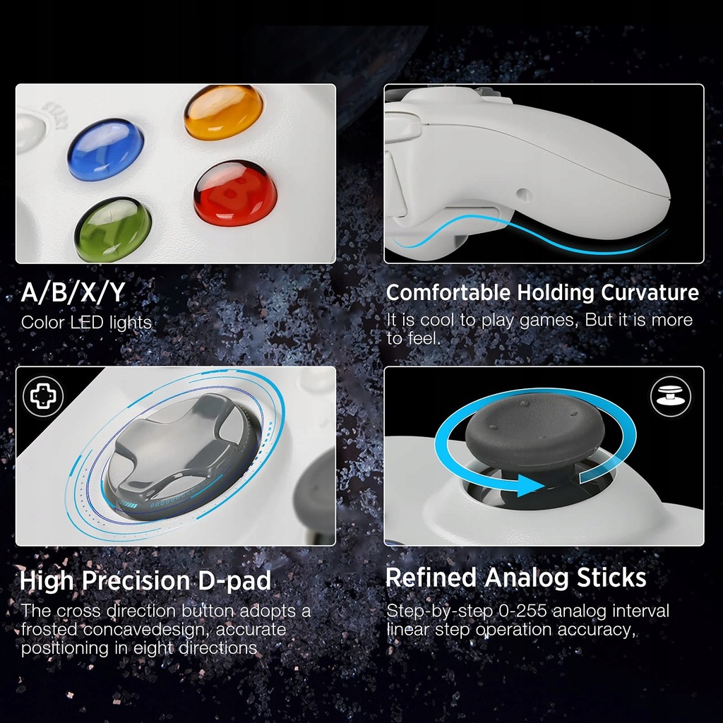 ☆ Эргономичный дизайн. С двухточечным триггером и восьмипозиционной клавишей со стрелкой. Новый дизайн кнопок на левом и правом плечах удобен в использовании. Два встроенных двигателя, обеспечивающие виброотдачу. Джойстик более удобно лежит в руке.