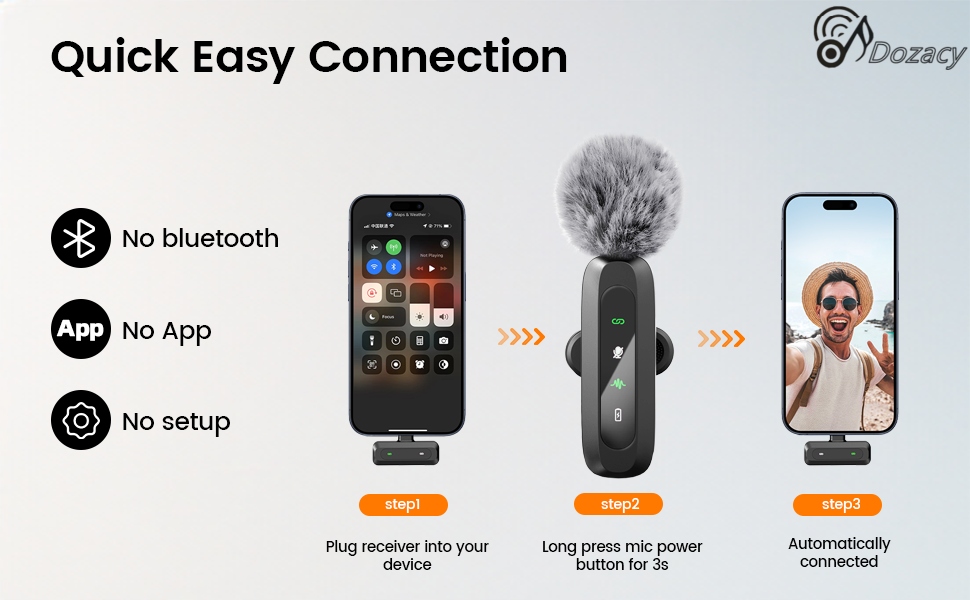 - 4. Петличный микрофон готов к использованию по принципу «подключи и работай», автоматически соединяется с iPhone/iPad, поддерживает передачу на расстояние 30 футов и всенаправленную радиосвязь на 360°, обеспечивая чистое качество звука, но учтите, что на фактическую передачу влияют помехи и препятствия 2,4 ГГц; li>