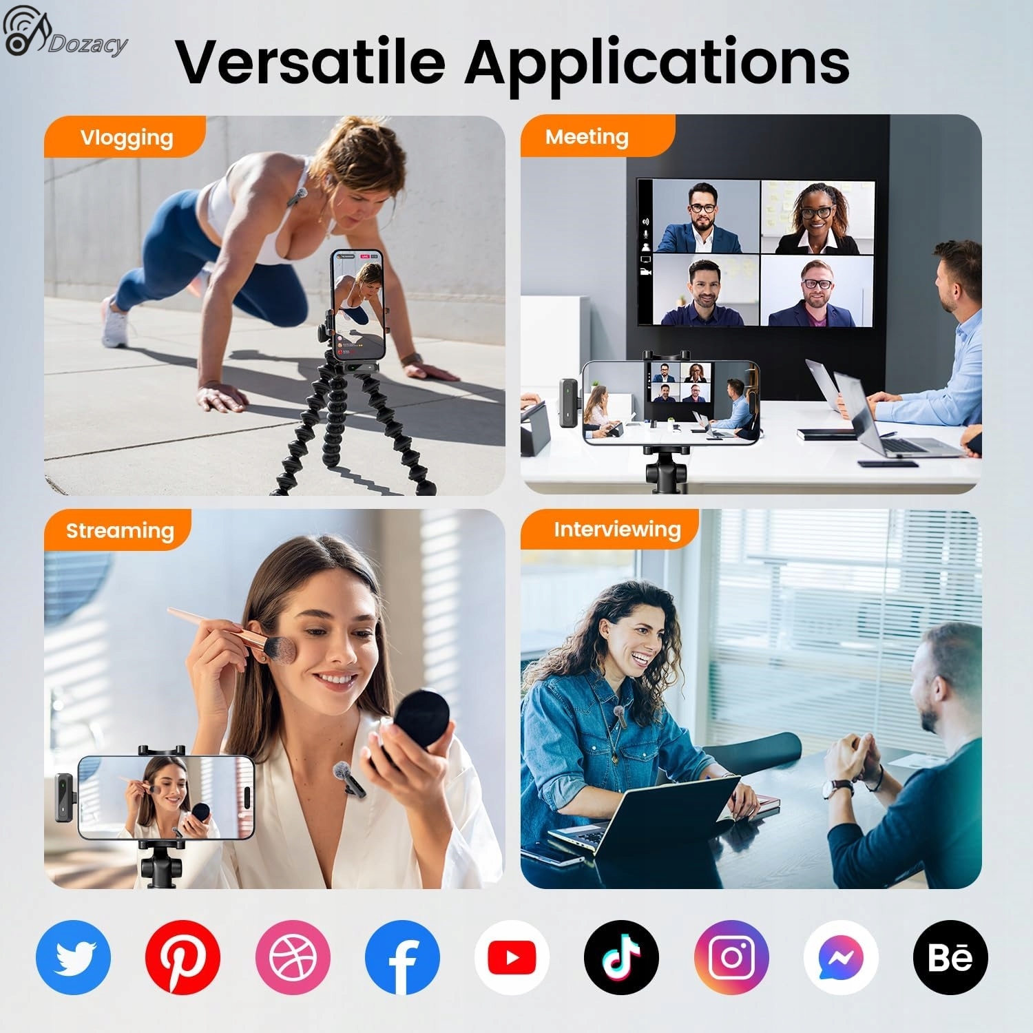 - Улучшите свою запись с помощью беспроводного петличного микрофона из двух комплектов! Подключите свой iPhone/iPad по беспроводной сети, прикрепите микрофон к одежде и наслаждайтесь записью без помощи рук на расстоянии. Идеально подходит для динамичной фотографии, записи на телефон и создания видео в крупномасштабных сценариях.