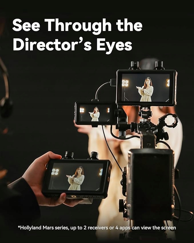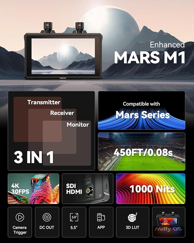 - это эффективный и универсальный монитор камеры с интегрированным решением беспроводной передачи видео, которое значительно снижает вес камеры. Этот беспроводной монитор может быть легко переключен на передатчик или приемник и сочетается с Mars 4K/ Mars 400S Pro/ Mars 300 Pro/ Mars M1 для беспроводной передачи. Как передатчик Mars M1, он позволяет отслеживать до 4 мобильных устройств через приложение.