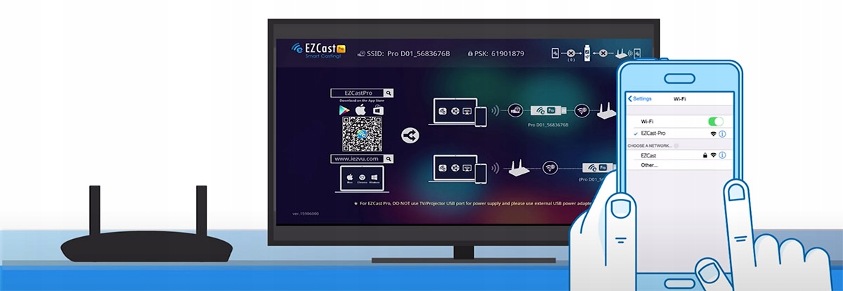 Устройство оснащено двумя антеннами Wi-Fi с поддержкой сетей 802.11n 2,4 ГГц и 802.11ac 5 ГГц, что обеспечивает высокую пропускную способность и стабильное соединение. Передавайте изображения в режиме реального времени без задержек. EZCast Pro Box B02 обеспечивает передачу на расстояние до 15 метров (фактическая дальность также зависит от внешних факторов, таких как стены, другие сетевые устройства и т. д.). Простота в использовании. Каждый должен иметь возможность установить и использовать его без какие-то проблемы. Подключите EZCast Pro B02, например, к телевизору с помощью кабеля HDMI, затем к источнику питания и включите его. Включите беспроводную сеть Wi-Fi на смартфоне и зайдите в настройки. Найдите сеть EZCast Pro B02 (ProBox_xxxxxxx или ProBox5G_xxxxxx) и подключитесь к ней. Тогда включите приложения EZCast Pro и наслаждайтесь широким спектром возможностей и функций.