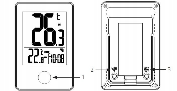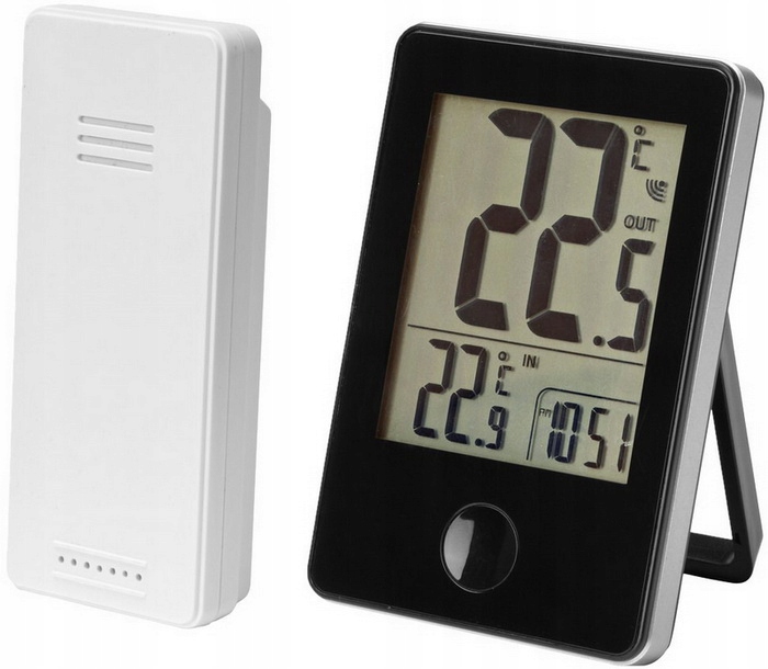 Диапазоны измерения термометра от +/- 0 до +50°C для внутренней температуры и от –40 до +60°C для внешней температуры. Базовый блок запоминает минимальную и максимальную температуру и может отображать измерения в °CC (градусах Цельсия) или °F (градусах Фаренгейта). Часы выставляются вручную.