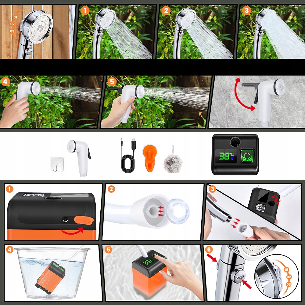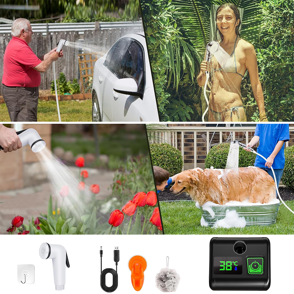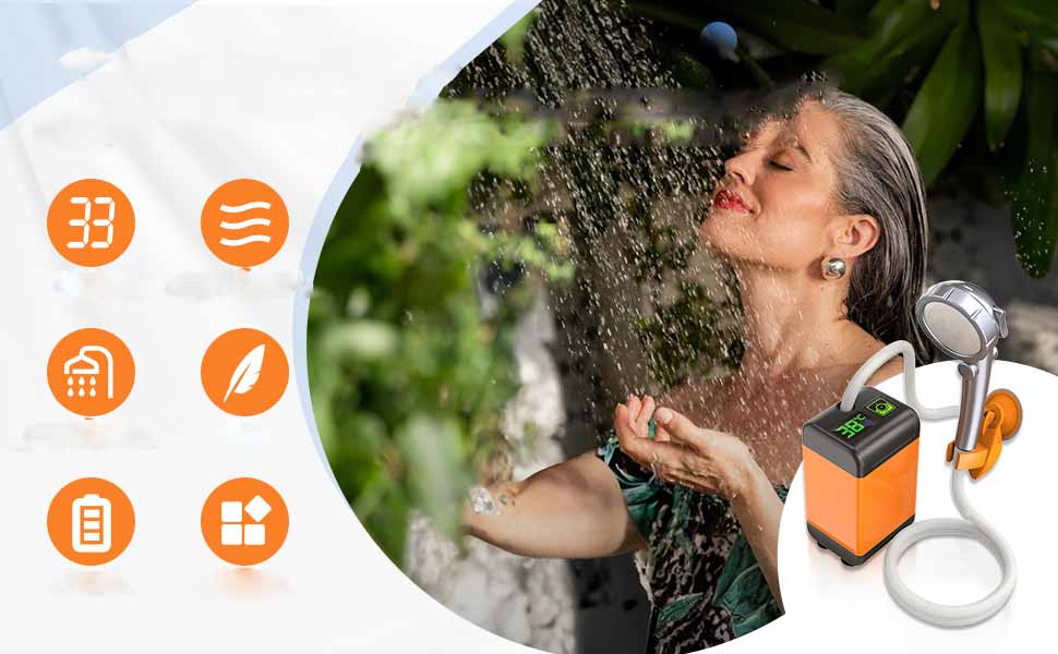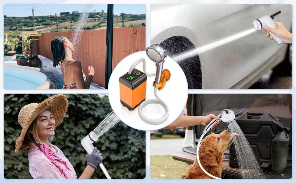 - ✔ 【Портативный душ для кемпинга】 - душ кемпинг оснащен новым двигателем, который повышает эффективность водоснабжения и обеспечивает постоянный поток воды в 6-8 литрах в минуту. Увеличьте емкость батареи, чтобы продлить время использования. Оснащенный двумя душевыми головками и гибким шлангом с длиной 2 метра, гарантирует роскошную ванну даже на открытом воздухе. Благодаря этому вы можете быть уверены, что во время купания на открытом воздухе вы получите максимальную защиту и удобство, и вы будете наслаждаться лучшими ощущениями купания, везде, где ваши приключения руководили вами.