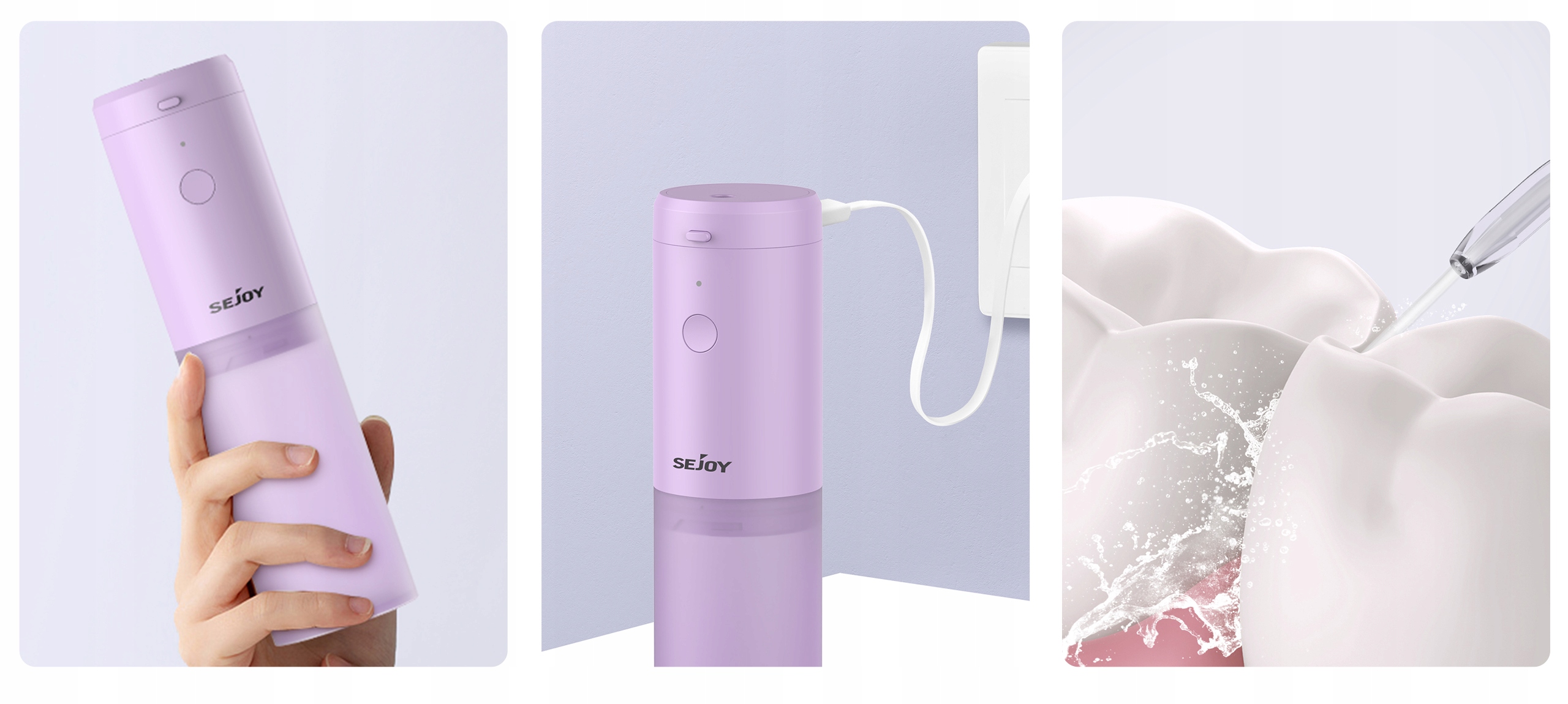 Портативный стоматологический ирригатор Sejoy, небольшого размера, легкий, легко помещается в сумку, не занимая места. Для зарядки используйте USB Type-C, не нужно носить с собой дополнительные зарядные устройства, можно быстро зарядить ирригатор. Это лучший выбор для офиса, командировки и путешествий.