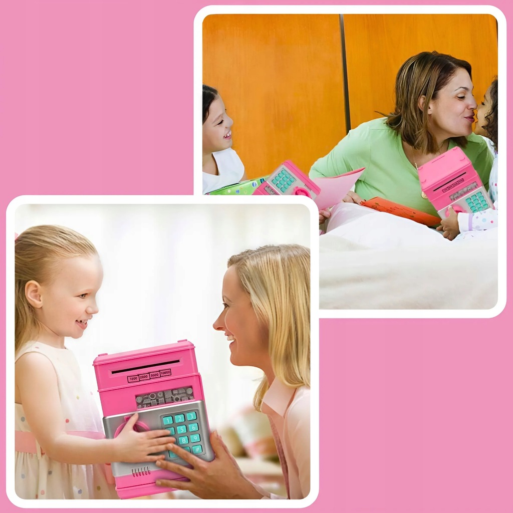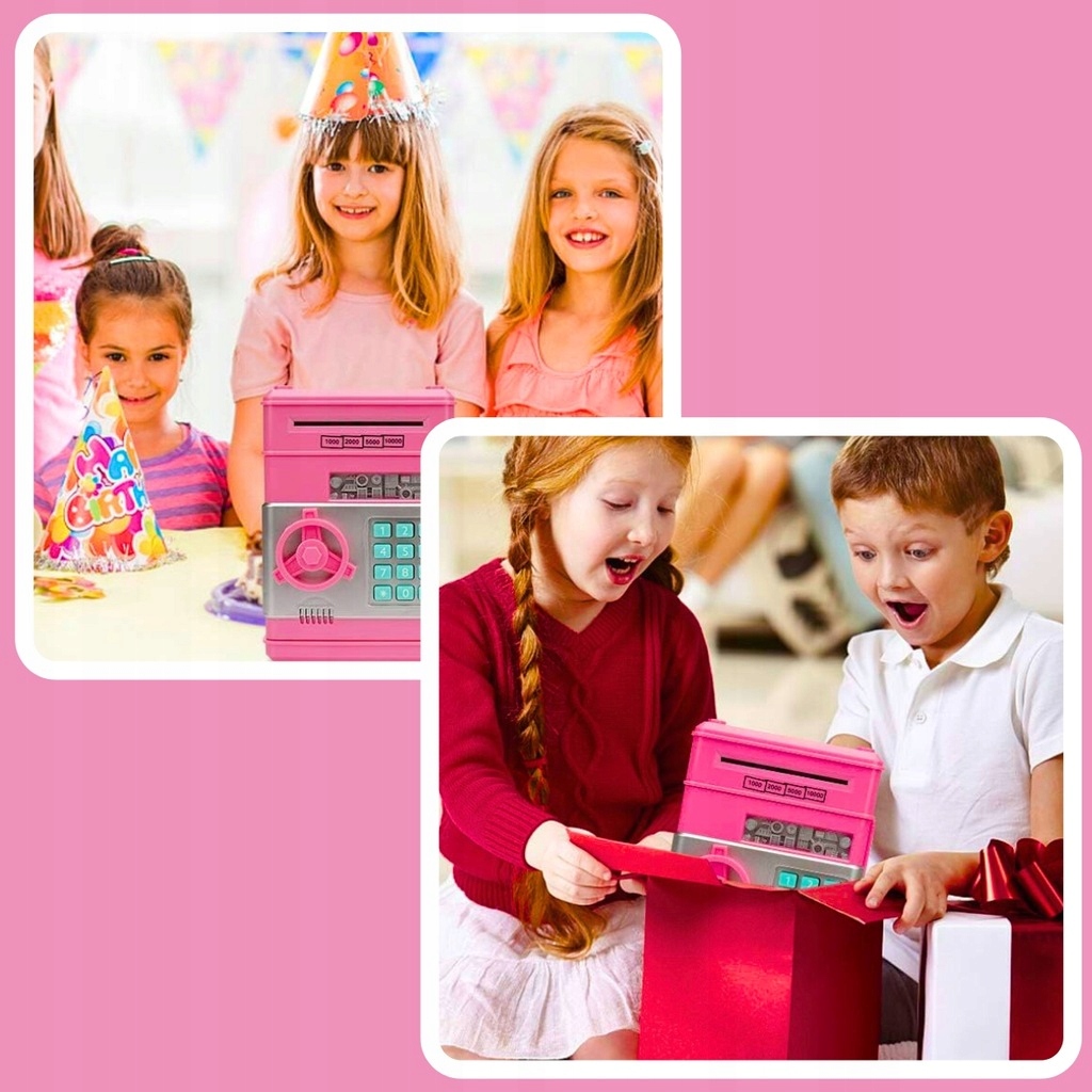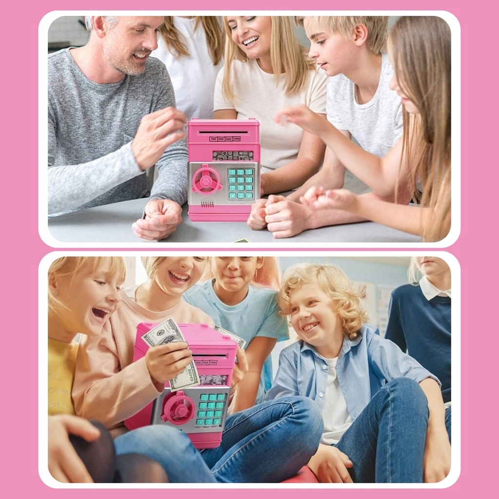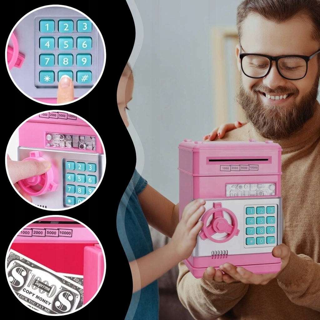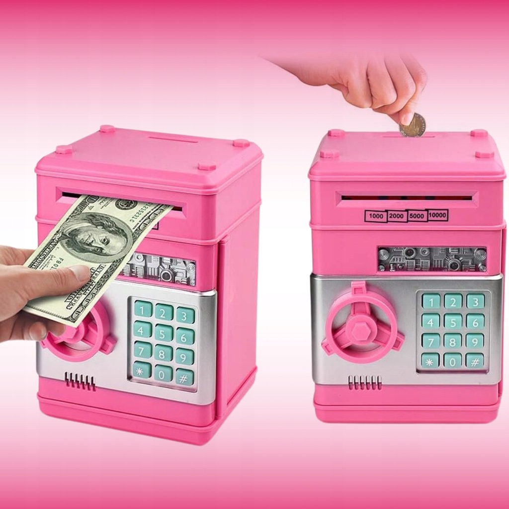 БЕЗОПАСНЫЙ ДЕТСКИЙ АТМ-КОПИЛКА С КОДОМ ДОСТУПА МОНЕТЫ БАНКНОТЫ РОЗОВЫЙ