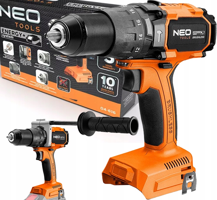 Дрель-шуруповерт ударная 100 Нм Energy+ 04-616 от NEO Оснащен бесщеточным двигателем и ударным механизмом. Он работает от аккумуляторной системы Energy+ и совместим с литий-ионными батареями. Рекомендуемая емкость аккумулятора — 4 Ач. Инструмент характеризуется крутящим моментом 100 Нм и частотой ударов – 7680 на 1-й передаче и 30400 на 2-й передаче.Максимальные обороты достигаются 480 об/мин (1-я передача) и 1900 об/мин (2-я передача). Оснащен цельнометаллической головкой и быстрозажимным сверлильным патроном диаметром 13 мм. Дрель-шуруповерт имеет подсветку и удобную прорезиненную ручку. Дополнительная ручка облегчает работу с инструментом. Устройство весит всего 1,53 кг. Это продукт бренда NEO, рекомендуемый профессионалам и любителям DIY.