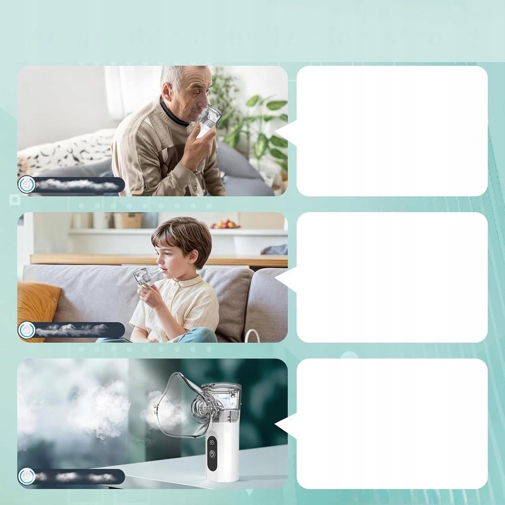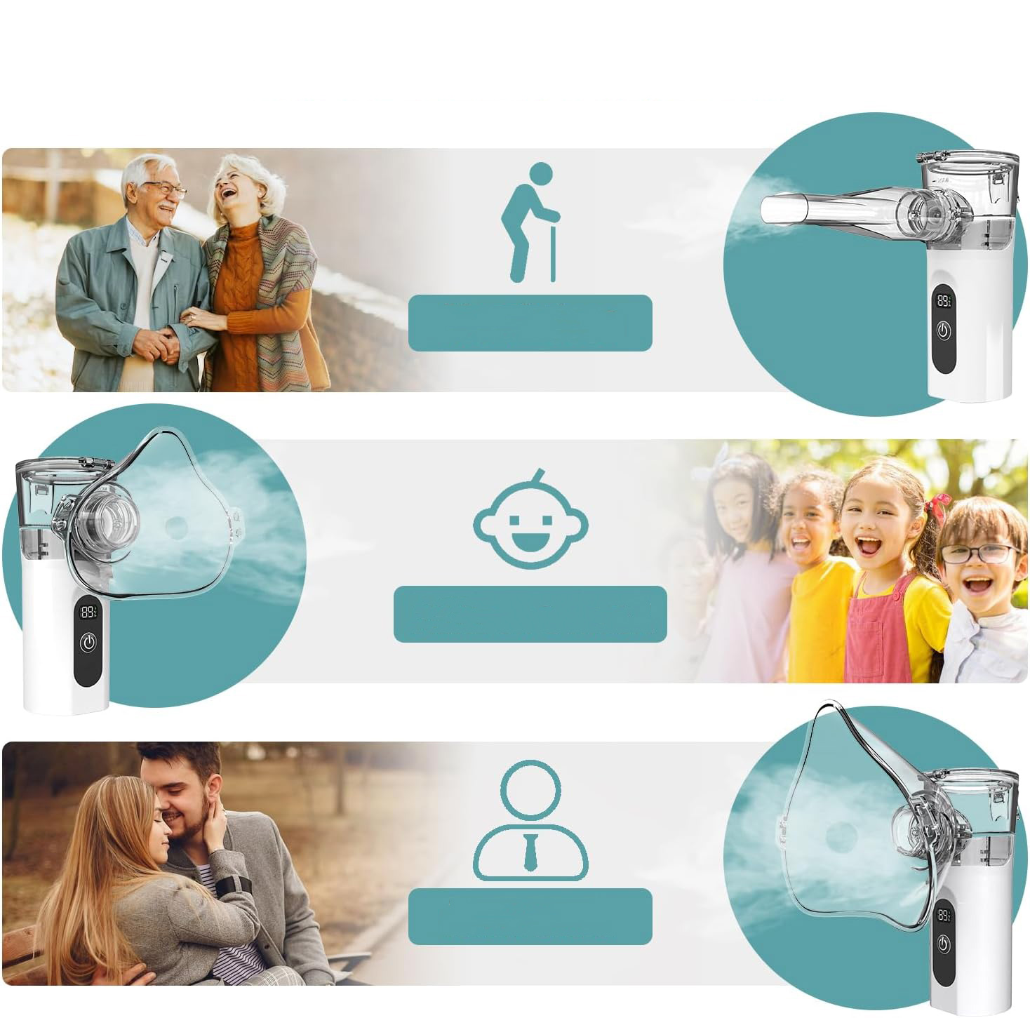 🍃 Эффективный распылитель жидкости: Это портативное ингаляционное устройство незаменимо для людей, страдающих респираторными заболеваниями. Небулайзеры используют высокочастотные вибрации для разделения физиологического раствора на частицы аэрозоля. Размер частиц составляет 3,7 мкм ± 25%, что обеспечивает более быстрое облегчение и более быстрое распыление. Идеально подходит для занятых людей и маленьких детей, снижает беспокойство детей и взрослых при распылении.