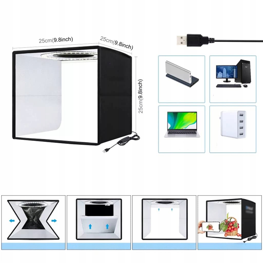 - Портативная складная конструкция, простая в установке и переноске, встроенная светодиодная подсветка, средний свет, отсутствие теней и отражений на фотографии.