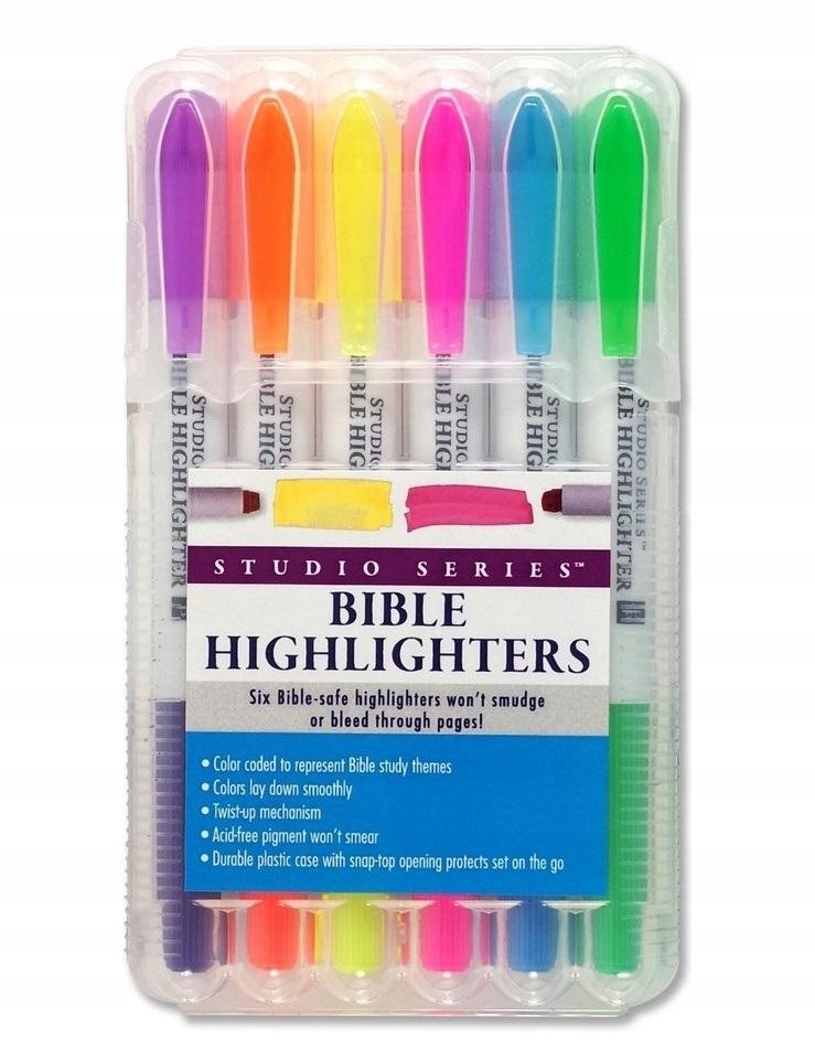 Набор из шести маркеров, безопасных для Библии, от Peter Pauper Press. Содержит синий, фиолетовый, зеленый, розовый, оранжевый и желтый цвета. Бескислотный пигмент не размазывается по страницам и не повреждает тонкие страницы. Плоские кончики гладко ложатся на тонкую бумагу. Прочный корпус из твердого пластика с застежкой-кнопкой защитит набор во время путешествий, а также может использоваться в качестве основы.