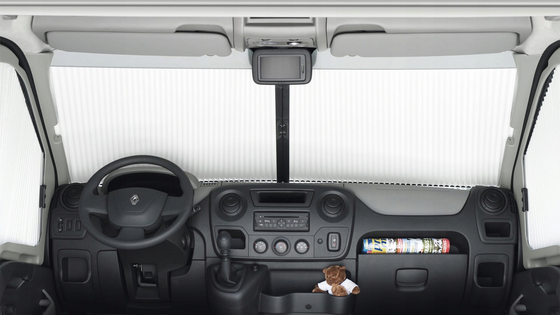 Индивидуальное решение затемнения кабины водителя благодаря превосходному затемнению защищает от нежелательных взглядов в салон автомобиля и значительно увеличивает полезное пространство в передвижном доме. Многослойная конструкция затемняющего материала также снижает нагрев или охлаждение автомобиля. Установка очень проста: разделенная передняя шторка крепится к указанным производителем точкам крепления на передних стойках (1) автомобиля. Оно направляется к центру лобового стекла через систему трубок, поэтому внутреннее зеркало не нужно снимать (2). Боковые панели, гофрированные с помощью направляющих и профилей, прикручиваются к дверной коробке. Маскирующий профиль, соответствующий дизайну салона автомобиля, делает высококачественную и прочную штору-плиссе практически незаметной в закрытом состоянии. Кроме того, REMIfront имеет предохранители (3), предотвращающие его выскакивание во время движения. Необслуживаемая система, визуально идеально вписанная в интерьер, отличается прочностью профилей, высоким качеством материала и плотностью света в жалюзи-плиссе. Даже возможные допуски автомобиля компенсируются спроектированной конструкцией, вентиляционные отверстия остаются свободными. Если не указано иное, Remifront нельзя использовать в автомобилях, оборудованных датчиком дождя, датчиком освещенности, перчаточным ящиком или подушками безопасности в стойках A и B или над боковыми дверями!