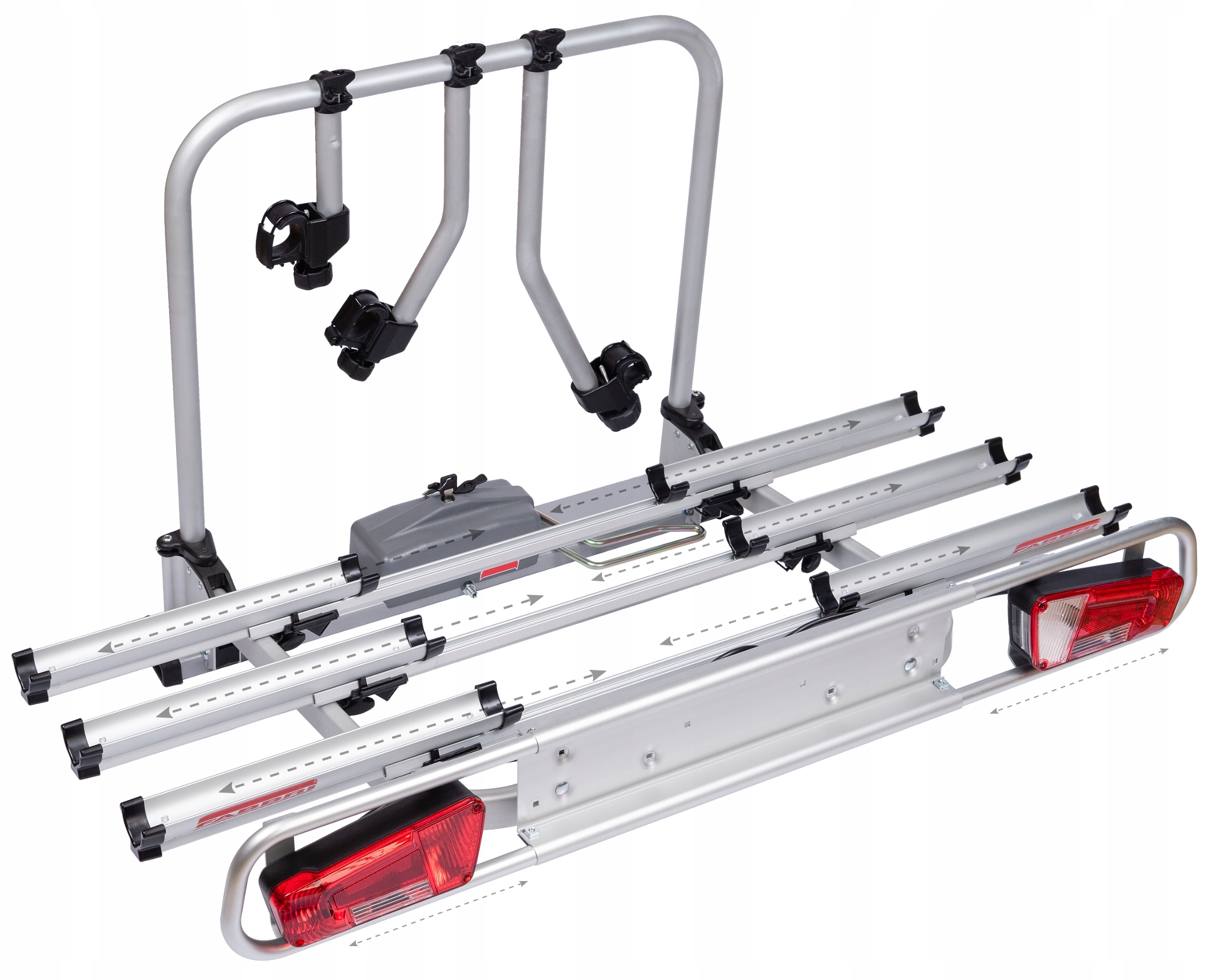 Телескопические направляющие регулируются по горизонтали от мин. 84 см до максимум 136 см. . Это позволяет перевозить велосипеды с колесной базой до 125 см.