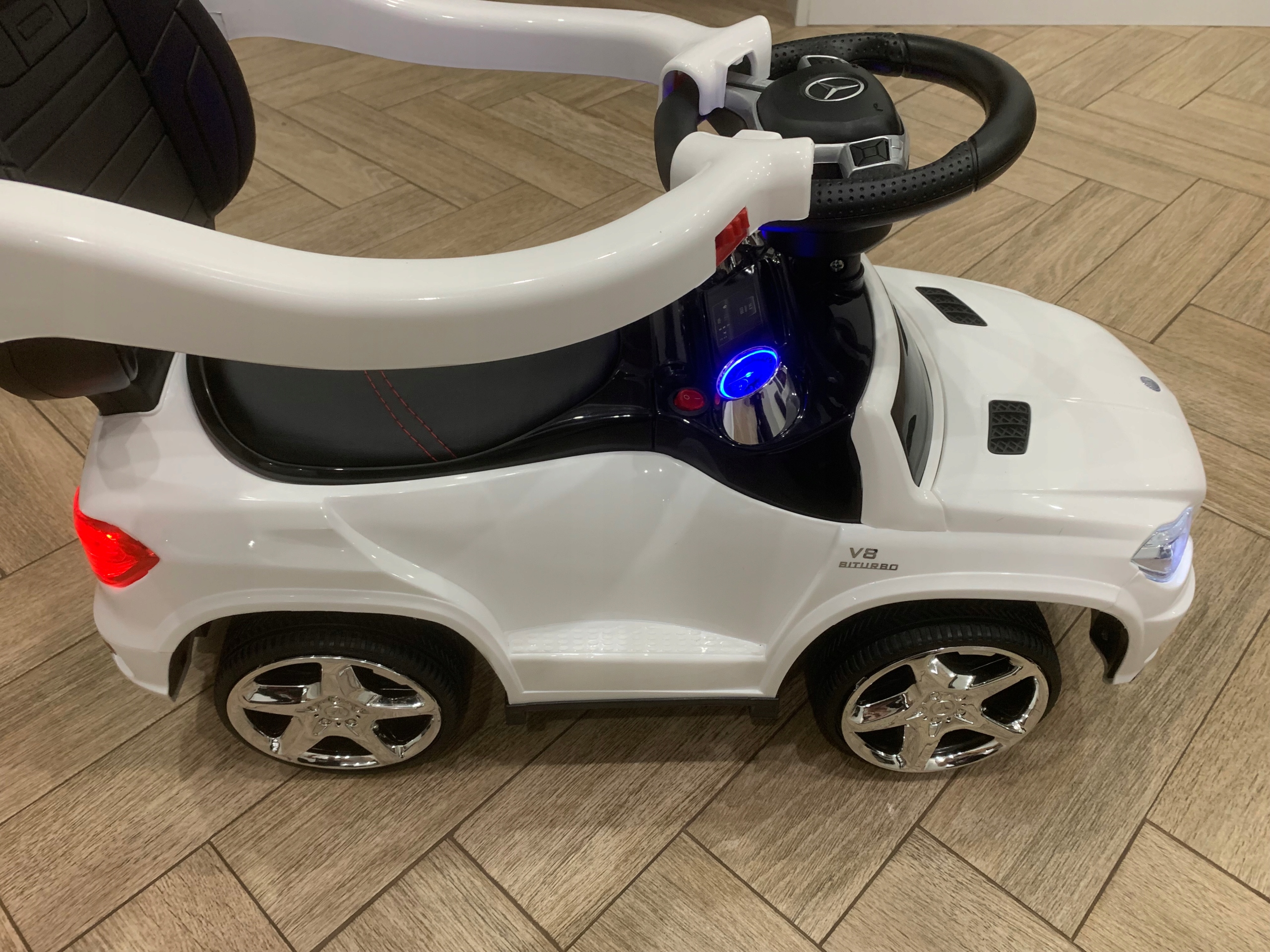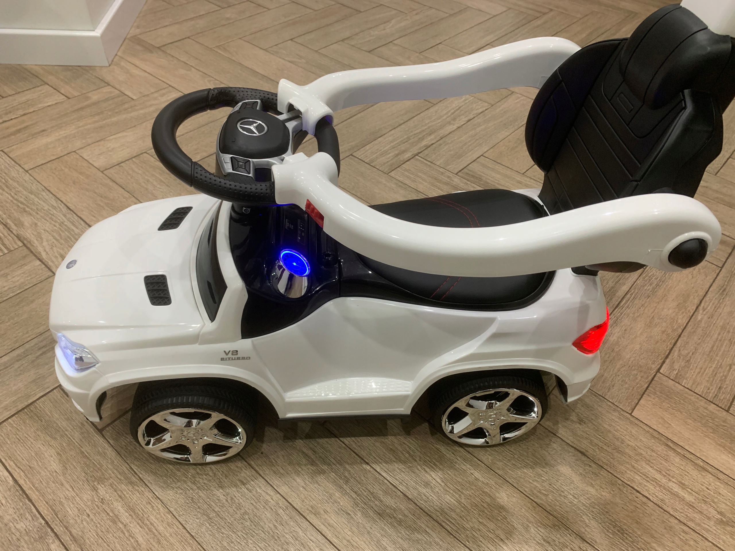 Этот слайдер Mercedes с ручным рулевым колесом, звуковым сигналом, настоящими фарами, решеткой радиатора и колесными дисками, напоминающими оригинальную модель, является идеальным автомобилем для самых маленьких исследователей как внутри, так и снаружи.