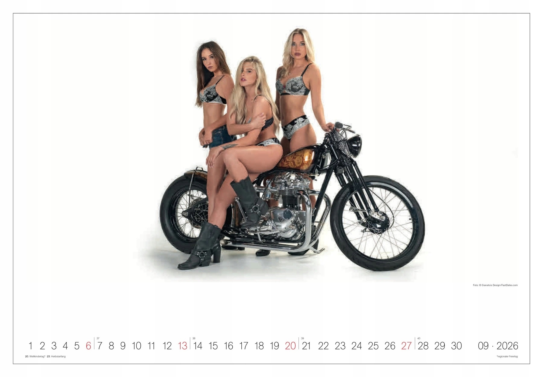 Очередной выпуск мотоциклетного календаря с красивыми женщинами на кастомных мотоциклах. 12 месяцев с уникальными фотографиями, которые заставят ваше сердце биться чаще. Как и каждый год, фотограф Джим Гианацис подготовил уникальный календарь, который должен быть в каждом гараже, клубе или мастерской.