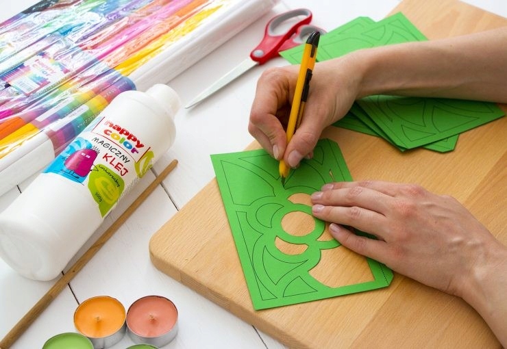 Вы можете сделать украшение в виде фонариков, используя, среди прочего, картон, папиросную бумагу и клей Happy Color.