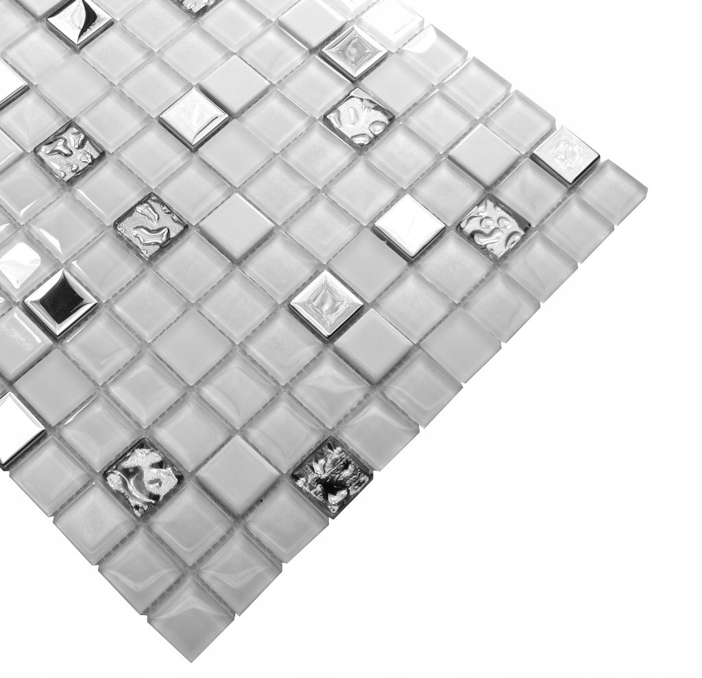 Стеклянная мозаика белоснежного цвета с добавлением серебристых мерцающих элементов