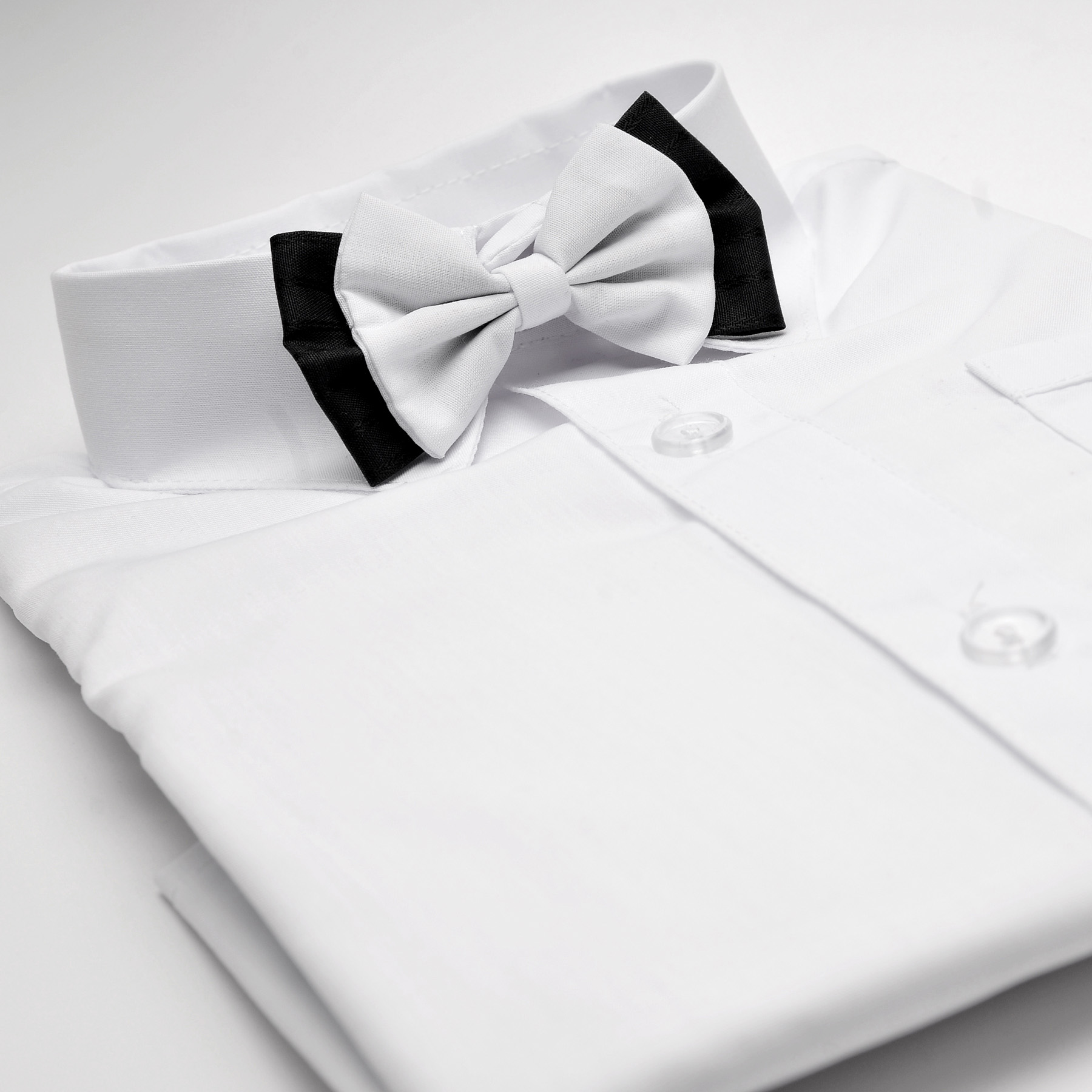 Элегантная рубашка для мальчика с длинными рукавами и эластичным галстуком-бабочкой. Имеется карман спереди слева. Идеально подходит для всех видов школьных, церковных или семейных торжеств.