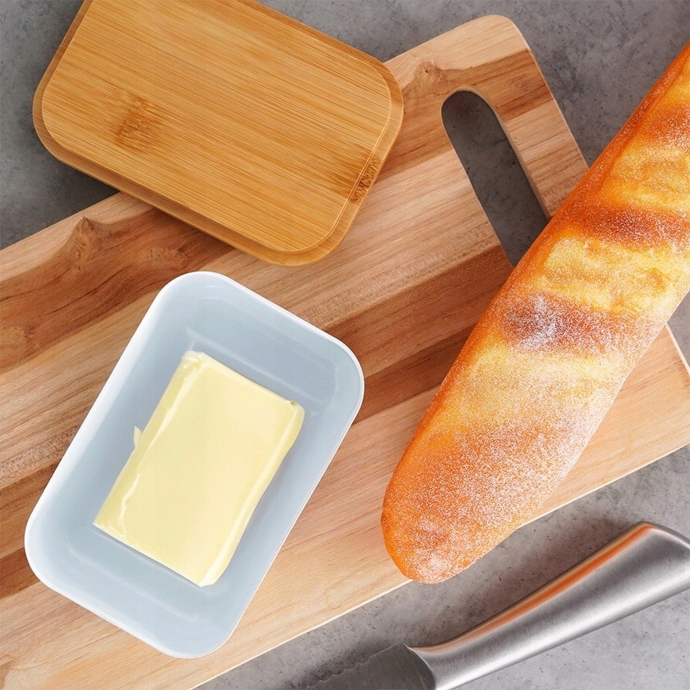 пахта из белой стали с бамбуковой крышкой и масло над надписью. Идеально подходит для хранения и подачи масла.