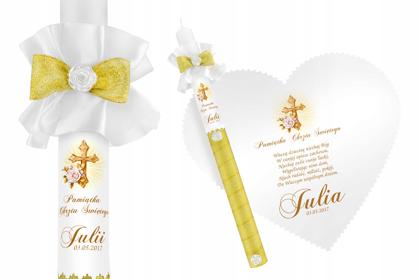 Элегантные наборы из свечей и крестильных халатов. Мы представляем десять комплектов в различных аранжировках. Каждый из них посвящен ребенку, которому предстоит Святое Крещение. Вы найдете стили, предназначенные для мальчиков и девочек. Декоративные элементы всех комплектов делают крестильную одежду и свечу очаровательным сувениром Святого Крещения. Настоящим сюрпризом станет белый крестильный халатик с именем ребенка. В комплект входит свеча с именем и датой Крещения. Это, безусловно, придаст всему этому уникальный характер. Посвятите набор для крещения, указав имя и дату церемонии, а также посвящение или пожелания. Выразительный принт сохранит свой вид на протяжении многих поколений. Соответствующая графика слегка отличает каждый набор, поэтому вы можете легко выбрать один из них. Свечи – это мастерство ручной работы, которое порадует каждого человека.