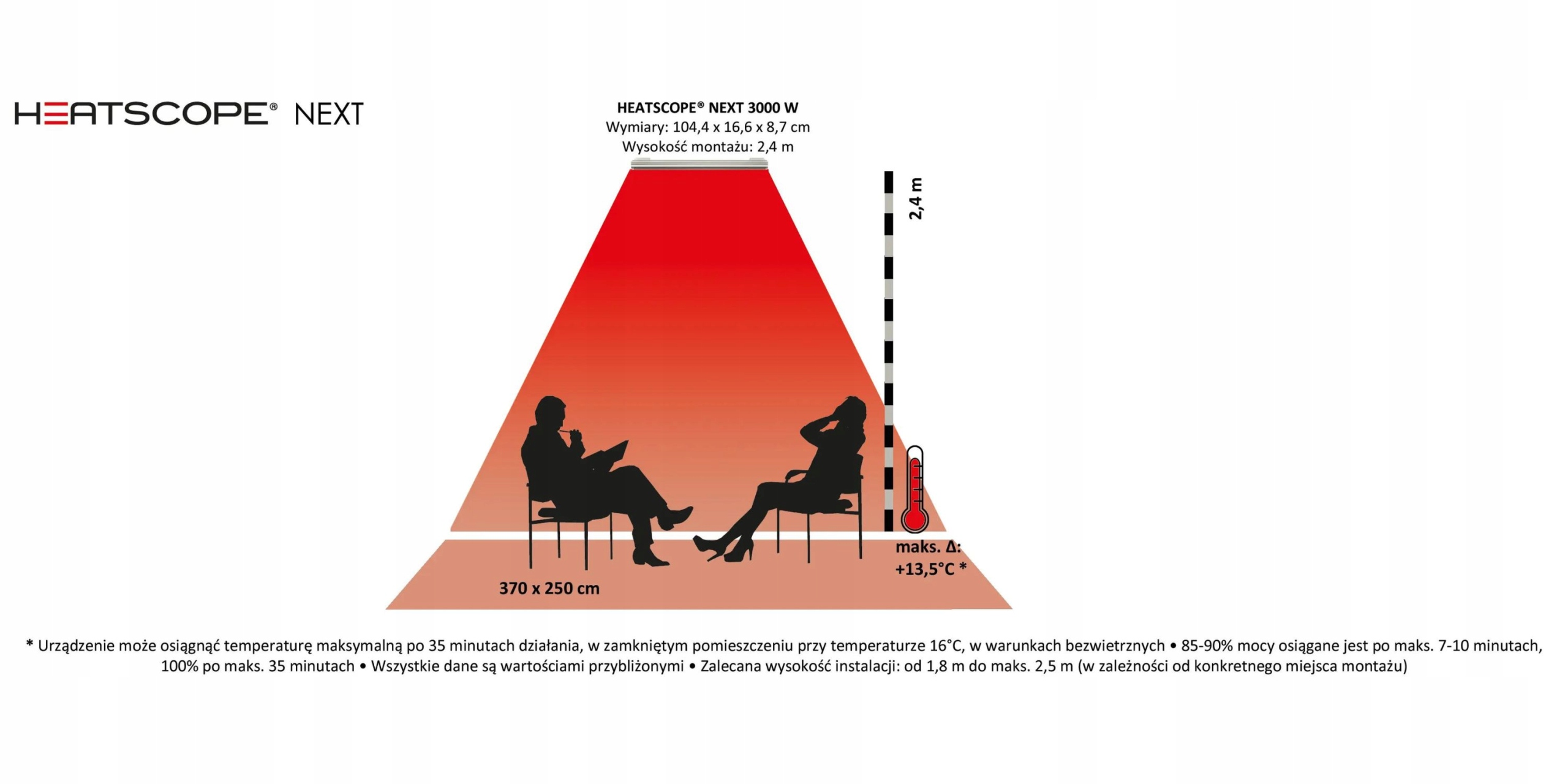Модель лучистого обогревателя NEXT мощностью 3,0 кВт от известного бренда HEATSCOPE предназначена для открытых и полуоткрытых поверхностей, подверженных воздействию ветра. Он идеально подходит для террас и балконов, а также для столовых и ресторанов.