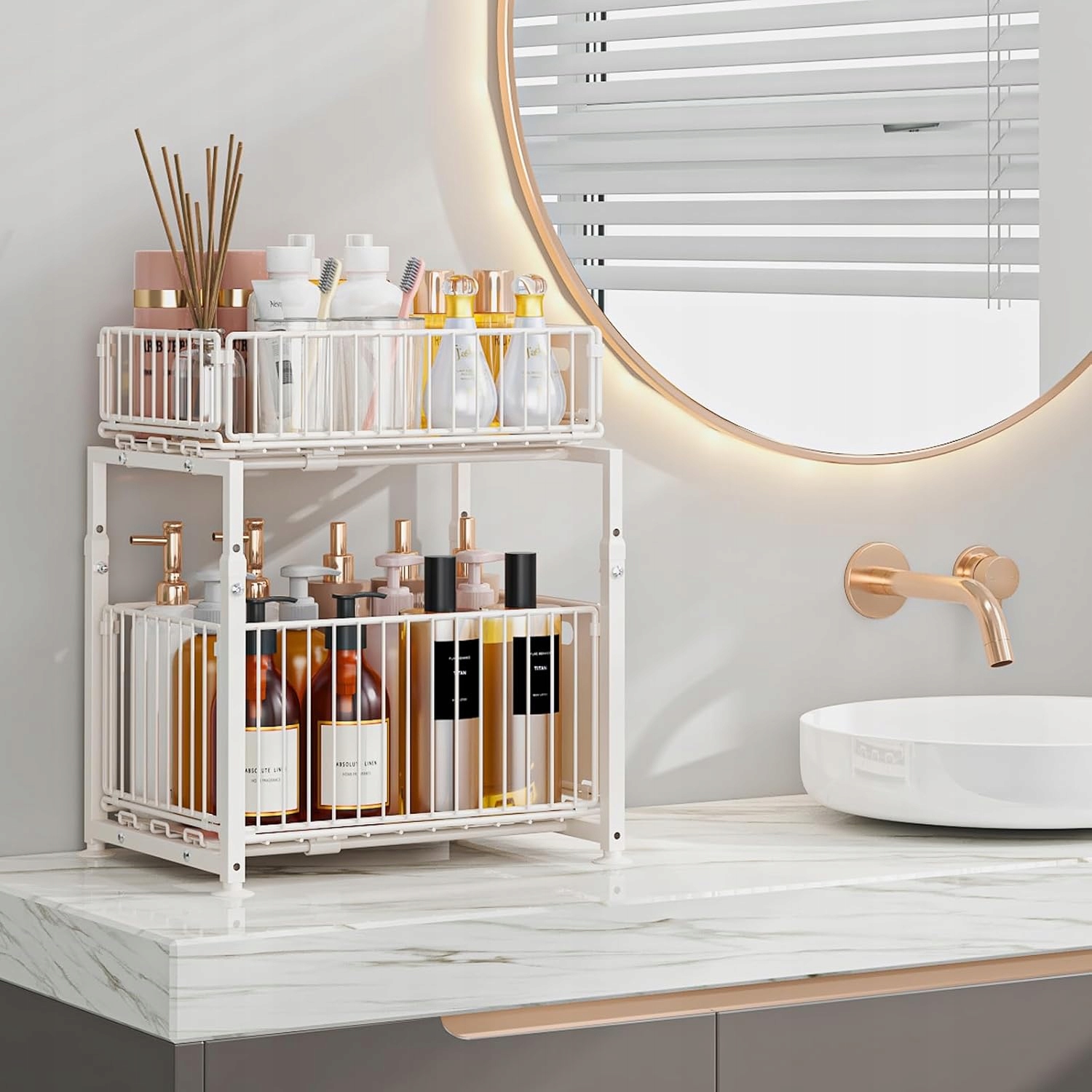 Двухуровневый металлический органайзер под раковину с выдвижными полками - белый или черный