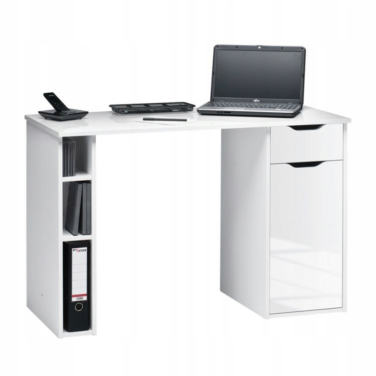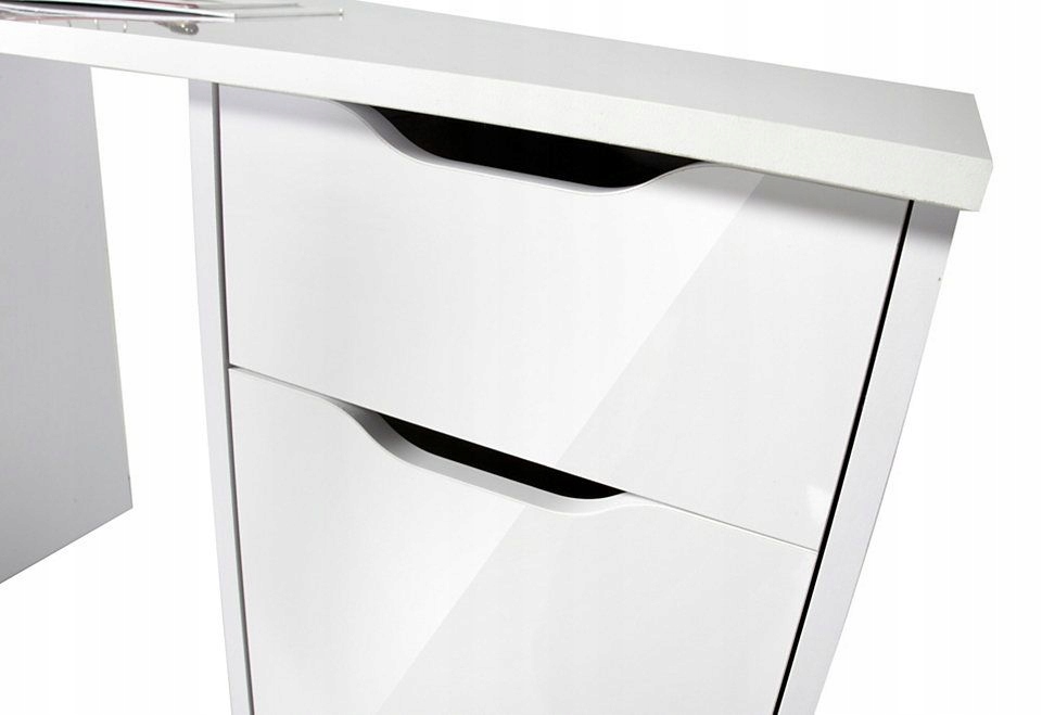 Письменный стол имеет функциональную нишу, ящик и дверцу. Столешница и фасады выполнены из глянцевой плиты МДФ.