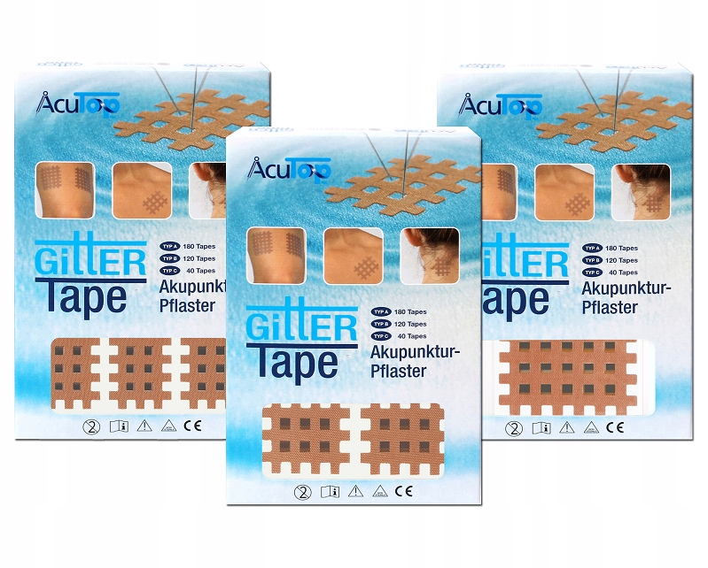 Нашивки с перекрестной лентой доступны в трех размерах (типах). Размер А (S) предназначен для детей или области лица, его можно использовать более длительный период в местах, где кожа подвергается сильному растяжению. Размеры B (M) и C (L) предназначены для больших участков тела, менее подверженных растяжению, например, внешней поверхности бедра, рук, ног и т. д.
