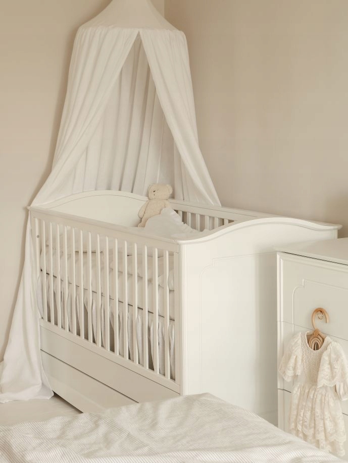 Коллекция белья состоит из: постельного белья и простыней различных размеров, чехла, декоративной подушки в форме звезды, валика для головы, балдахина, элегантных рюшей для кровати и пеленального столика. с двухсторонней накладкой. Он также прекрасно будет сочетаться с нашей хлопковой коллекцией.