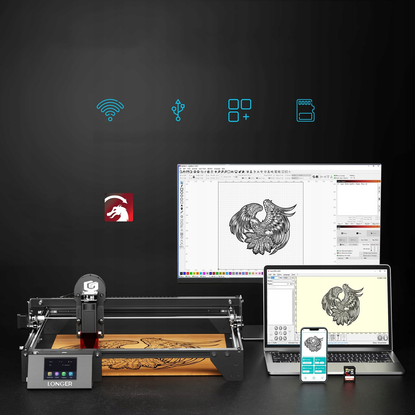Этот лазерный резак оснащен 32-разрядной материнской платой с ядром, обеспечивая мощную производительность для более стабильной и плавной работы. Данные можно отправлять с помощью 4 методов: Wi-Fi, USB-кабель, приложение и карты TF. Благодаря автономной поддержке вы можете использовать эту лазерную гравировку в любом месте и времени.
