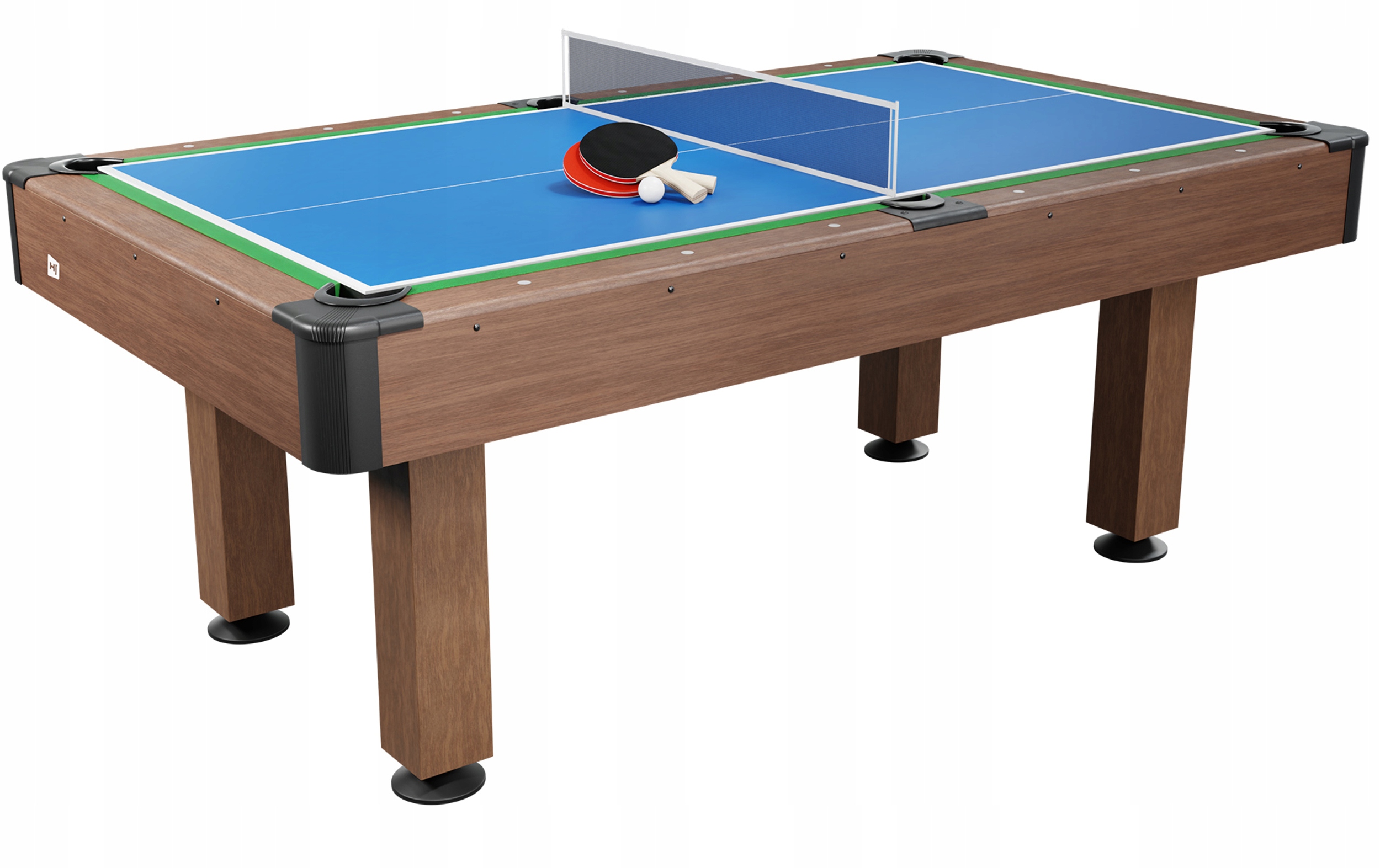 Бильярдный стол с системой корзин Spensers 7 FT от Hop-Sport в сочетании с двусторонним покрытием для настольного тенниса и аэрохоккея позволит вам получать удовольствие от игры, сохраняя при этом функциональность вашей столовой.
