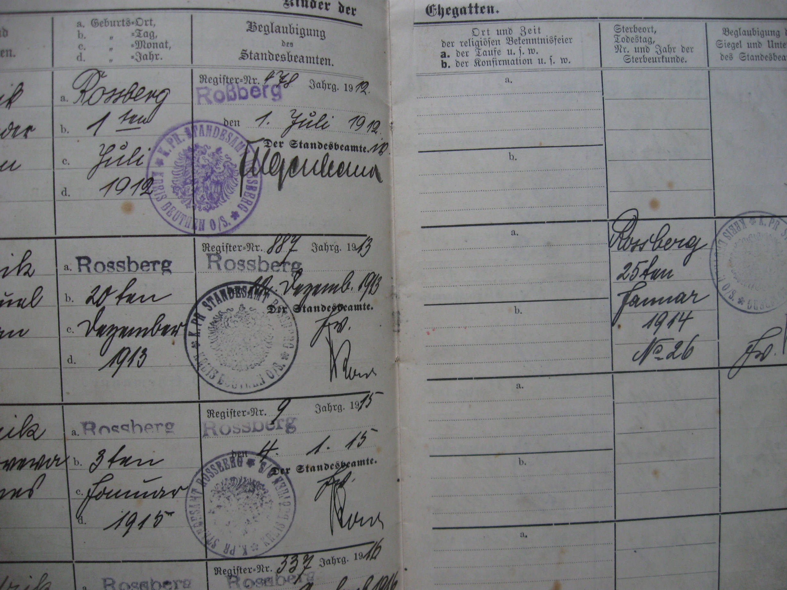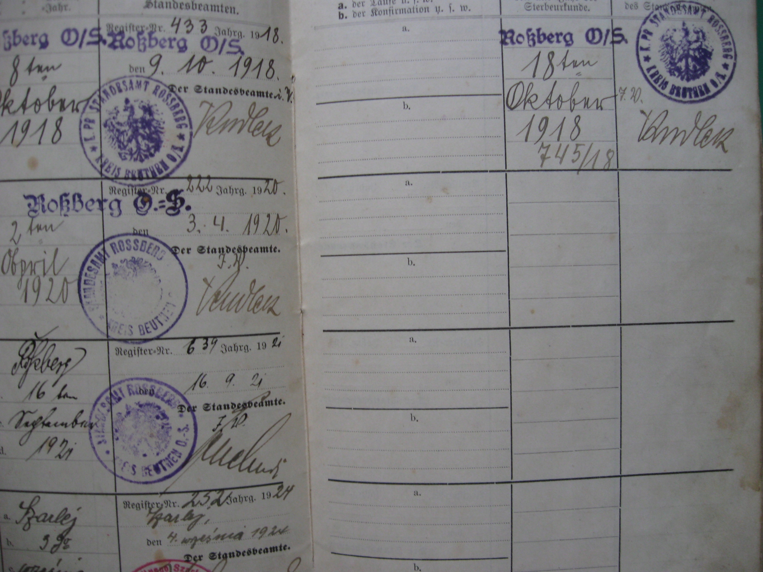 Семейная книга Бытомского района - Розбарк, содержит заверенные записи в книгах за 1989-1921 годы, подтвержденные официальными печатями и подписями. , устройство гражданские Россберг (Бытом - Розбарк) и Шарлей (Свентохловице).