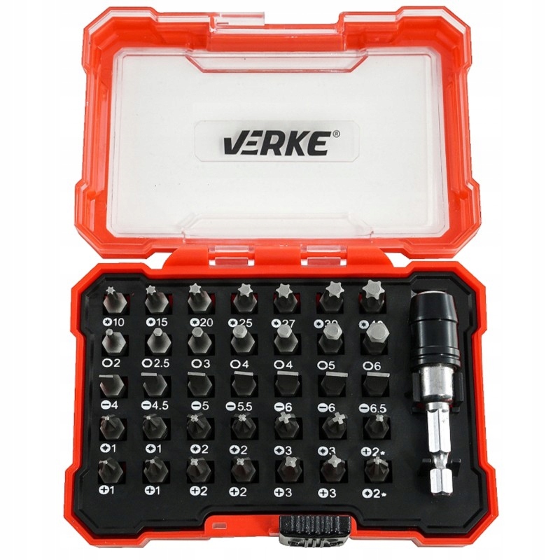 bits Verke - это набор профессионального оборудования, которое состоит из 36 элементов. 35 битов с длиной 25 мм были изготовлены из хромированной стали (S2). Магнитная быстрая ручка улучшает обмен битами. Все элементы были заказаны в практической, долговечной коробке для удобного хранения и транспорта.
