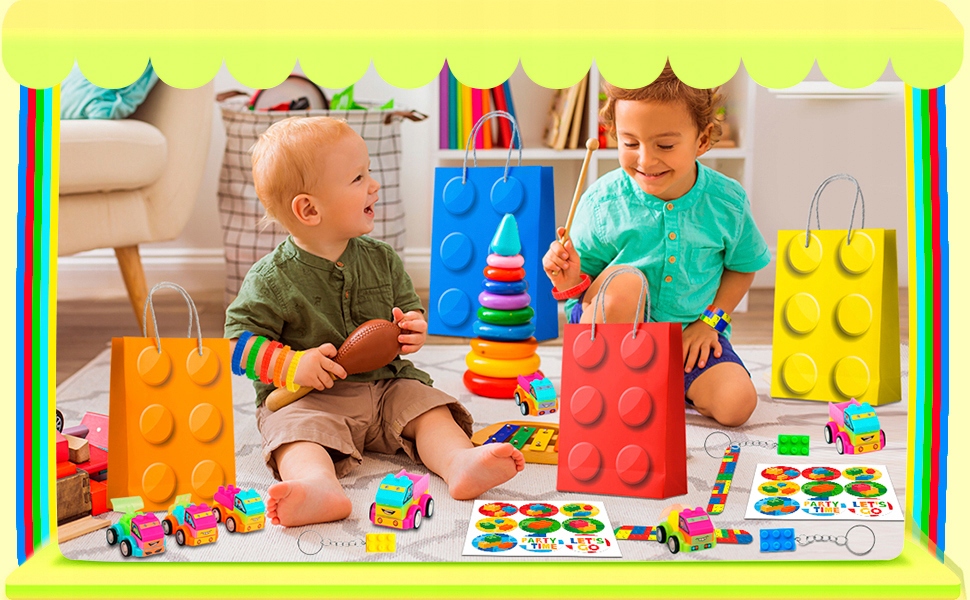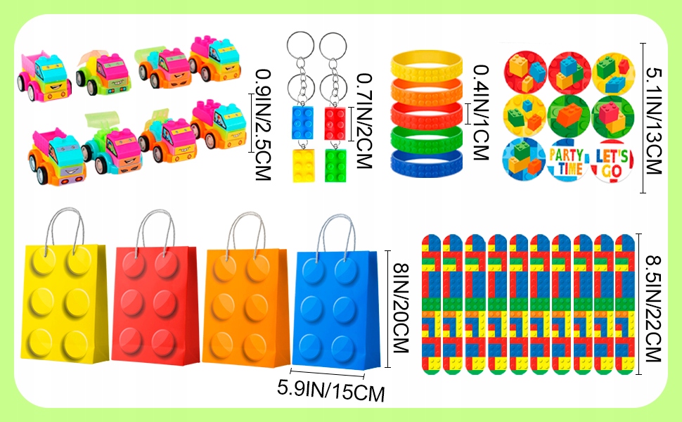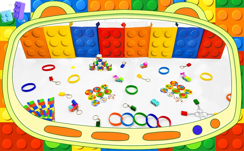 - ❤️Тематические украшения из блоков❤️ Этот детский подарочный набор включает в себя 12 сумок для вечеринки, 12 браслетов для вечеринки, 12 силиконовых браслетов с блоками, ключ из 12 блоков цепочки, 2 набора наклеек со строительными блоками и т. д. Вечеринка по случаю дня рождения с строительными блоками.