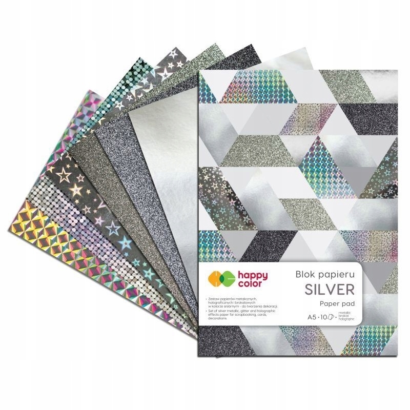 Блок бумаги «Серебро» — это 10 листов серебристого цвета, с различными эффектами, формата А5.