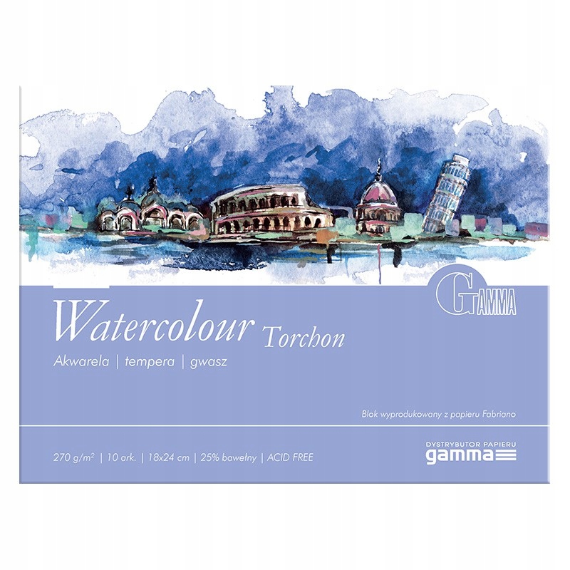 Fabriano Watercolor Torchon – блок для акварельных и водоэмульсионных красок. Бескислотная бумага с нежной текстурой «облака». Изготовлен из целлюлозы и 25 % хлопка.