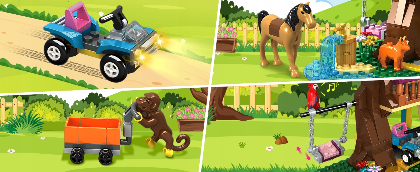 - ❤️Эта игрушка для строительства живого домика на деревевключает в себя лошадь, обезьянку, собаку, кошку, попугая, горную машину, тележку, игровую площадку для лазания и подробнее.Ждем более подробной информации!