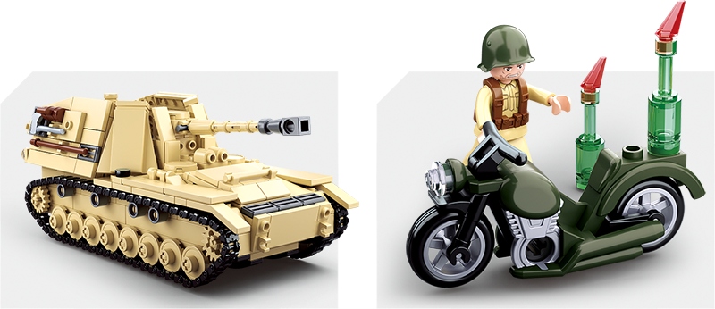 Блоки Армейский немецкий танк Pzkpfw IV/Nashorn (2 в 1) 543el - набор блоков, изображающих борьбу движения сопротивления против оккупанта на танке. Боевик на мотоцикле бросает в танк примитивную зажигательную гранату - КОКТЕЙЛЬ МОЛОТОВА, чтобы остановить его. Очень эффективное оружие против бронетехники.