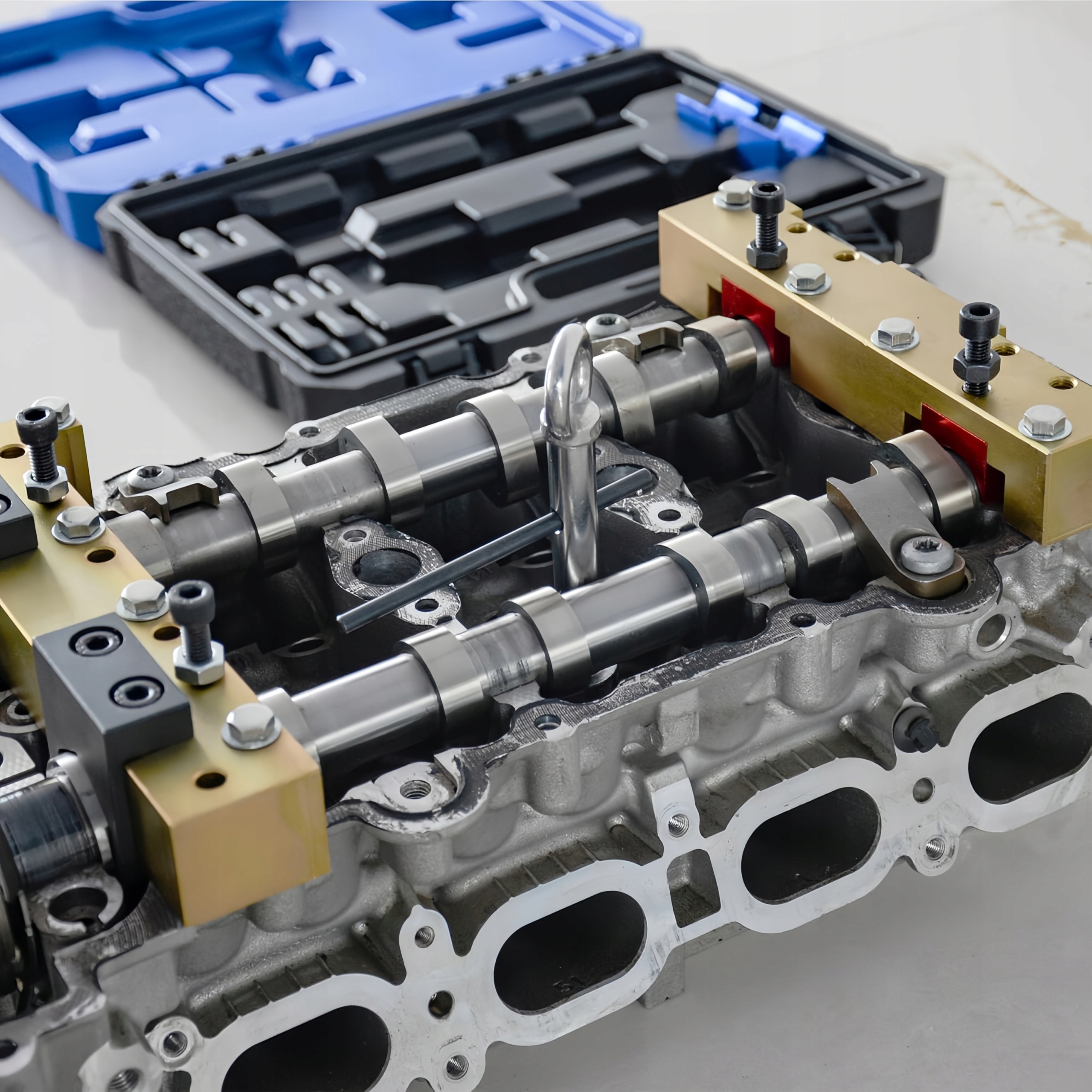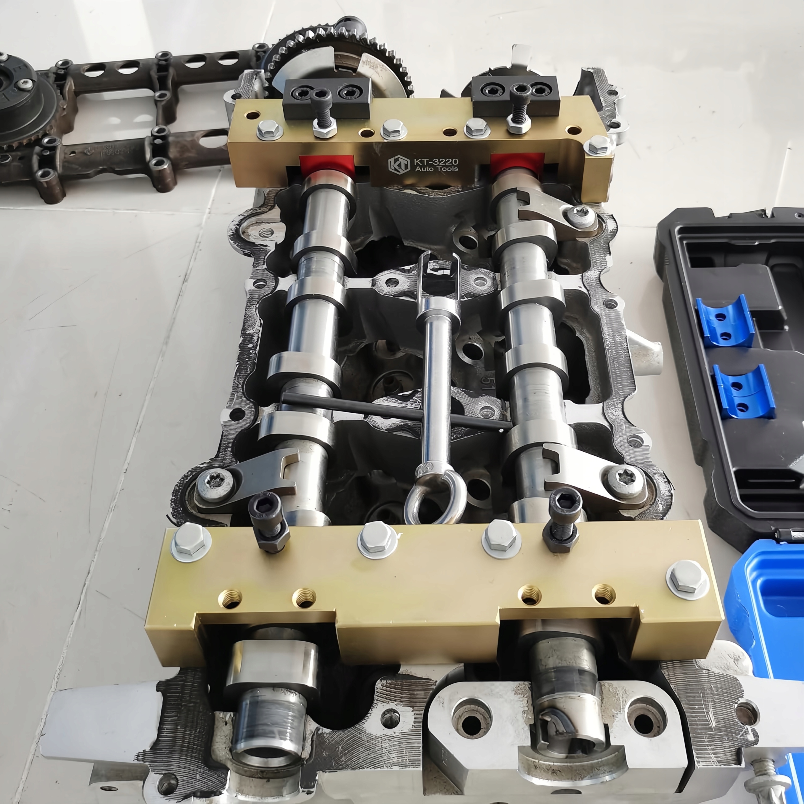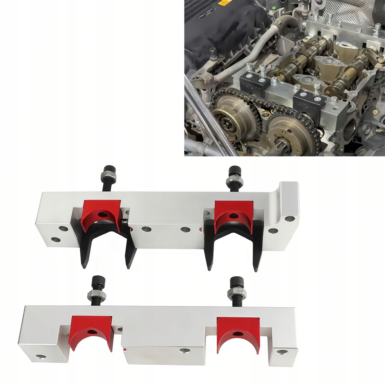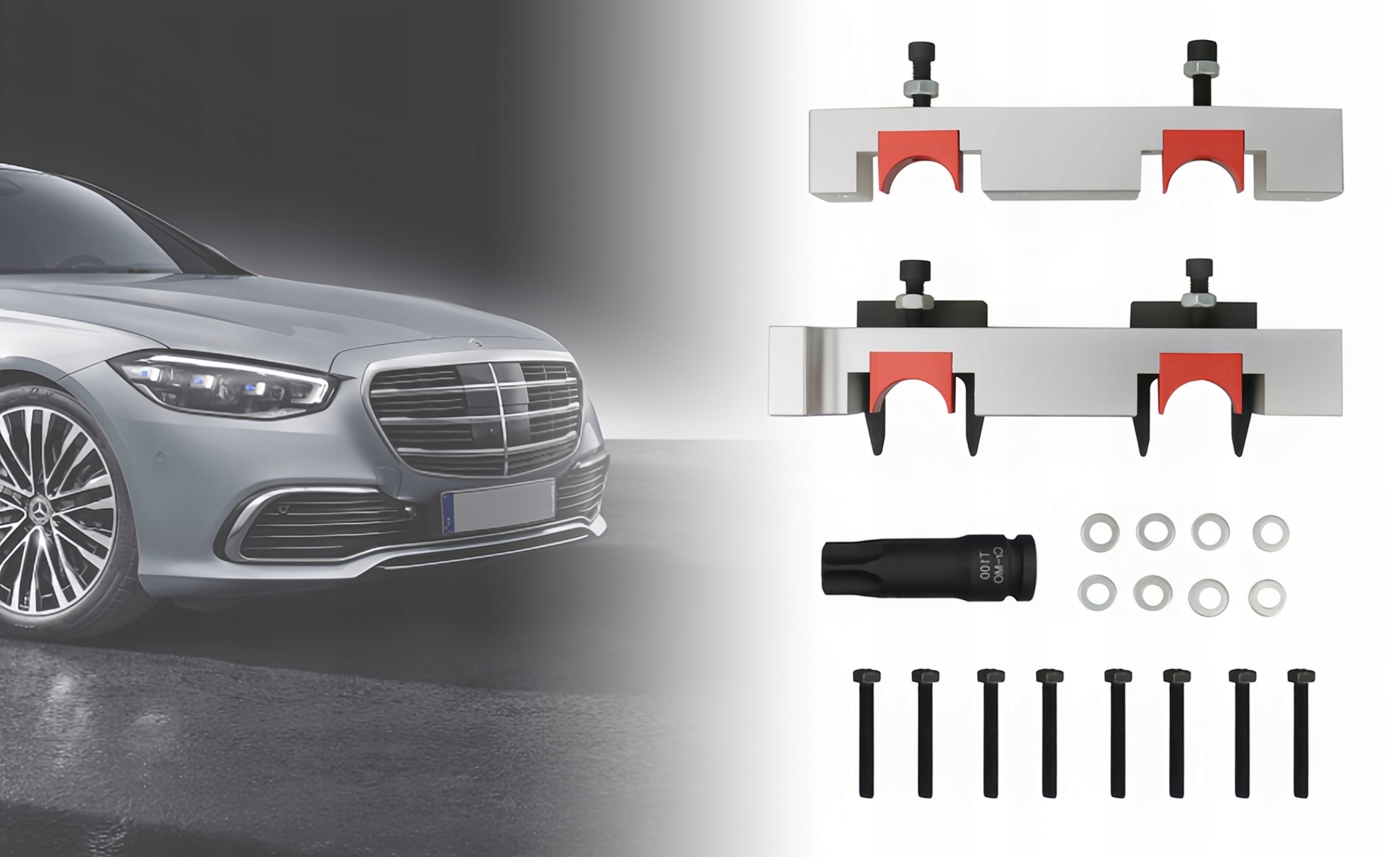 Набор предназначен для установки распределительного вала в положение ВМТ (верхней мертвой точки) в двигателях Mercedes-Benz с непосредственным впрыском бензина 1,6/2,0, оснащенных цепью привода ГРМ. Комплект позволяет удерживать и устанавливать распредвал, а также ослаблять и затягивать болты крепления шестерен распредвала.